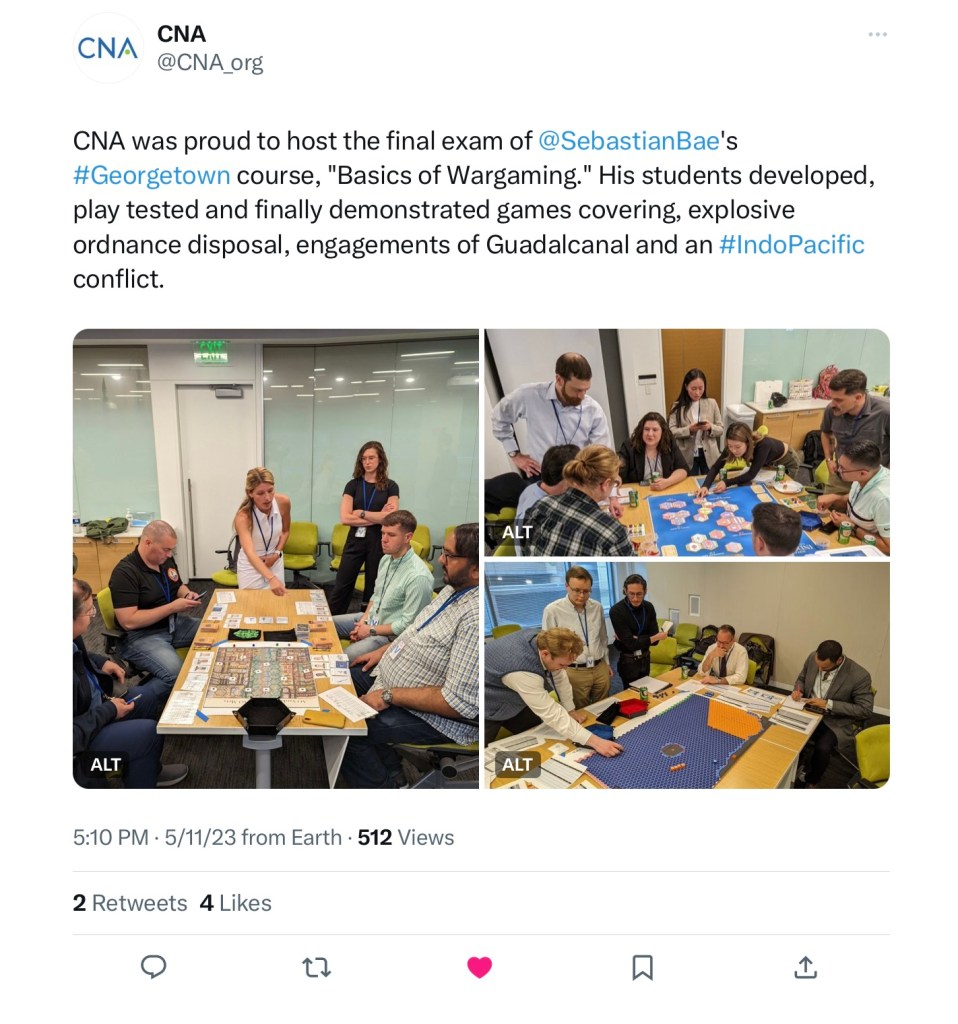 This week I was granted the privilege of attending the finals of Sebastian Bae’s Georgetown University wargaming class. There were three games being shown this particular night; a naval combat game covering the Battle of Guadalcanal, a DIME (Diplomatic-Intelligence-Military-Economic) influence game in the Indo-Pacific, and a tactical game for the USMC explosive ordnance disposal (EOD) schoolhouse.