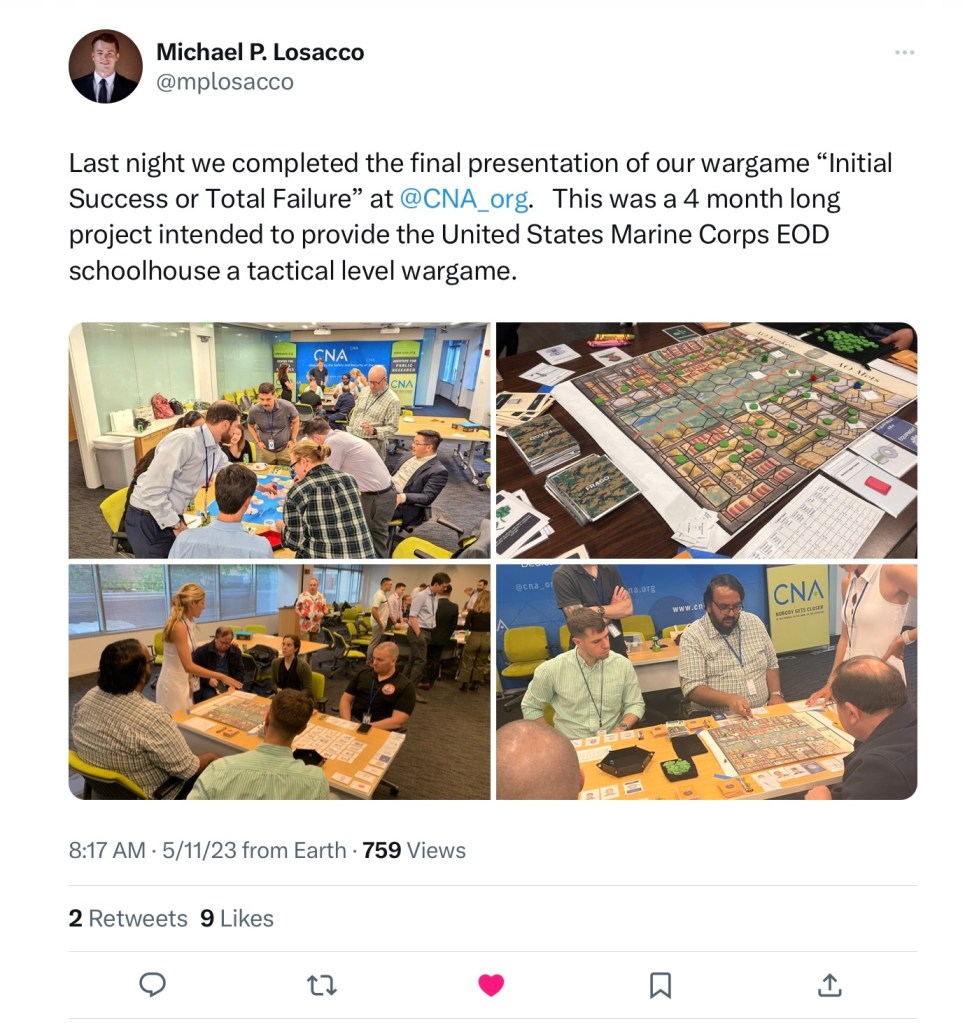 If you can’t tell by now I am very fond of Initial Success or Total Failure. As we conducted our After Action Review (AAR) with the design team afterwards, I think it was Ian Brown (@ian_tb03) who commented that once this wargame gets into the wild it is almost guaranteed that players will quickly make their own custom personality cards. One of the objectives of the game was to make it easy enough to carry that in a pocket or play on the hood of a HUMVEE. I think Initial Success or Total Failure will be finding its way into many pockets and adorning many HUMVEE hoods in days to come.