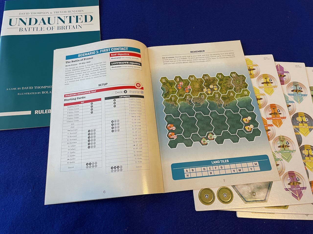 The most noticeable change in Undaunted: Battle of Britain as compared to previous editions is the use of hexes for the game board tiles. For experienced Undaunted players, a handy “If You’ve Played Undaunted Before” guide on page 3 of the Rulebook points out several differences from previous games. Of note, the guide also says, “If you have played Undaunted before, you should still read this rulebook.” I look forward to the amusing discussion and commentary in BGG forums from “experienced” players who ask questions that are otherwise easily answered if one simply READ THE DA*N RULES!