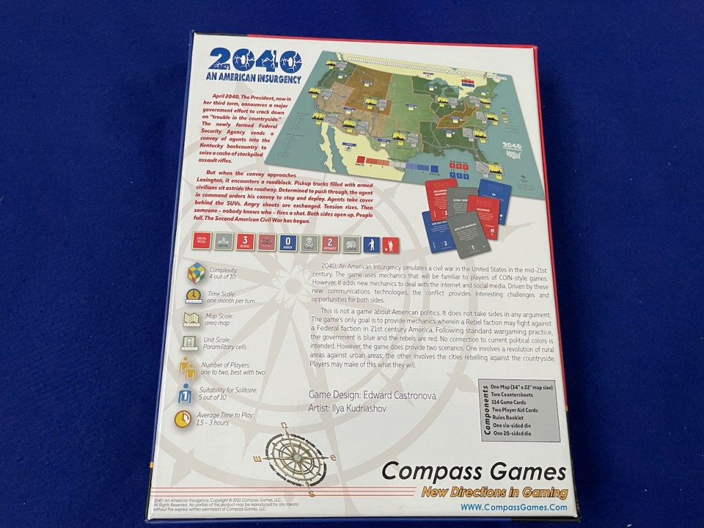 During the Kickstarter campaign for 2040: An American Insurgency (Compass Games, 2023) The Players Aid Blog posted an interview with designer Edward Castronova. Several of the questions revolved around the framing of the game and the seemingly obvious—and unavoidable—political overtones of the theme: