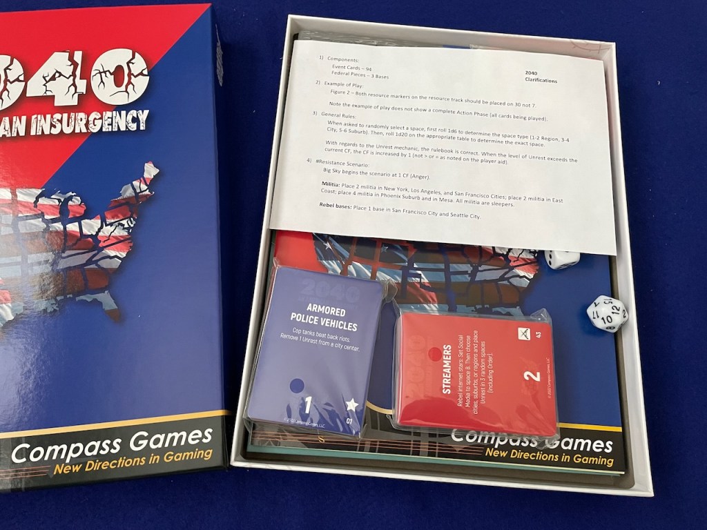 I am actually more surprised the critics of 2040: An American Insurgency are calling out the game for politics and not because it lacks cute wooden bits like any “real” COIN game includes. Nor does the game include Bots for either faction to enable solo play. The presence of an errata sheet, prominently found on top of the components when the box is first opened, immediately had me worried as to what other production issues I would find. Alas, there are a few annoying ones like repeated sections in the rule book that indicates another editorial pass was needed.