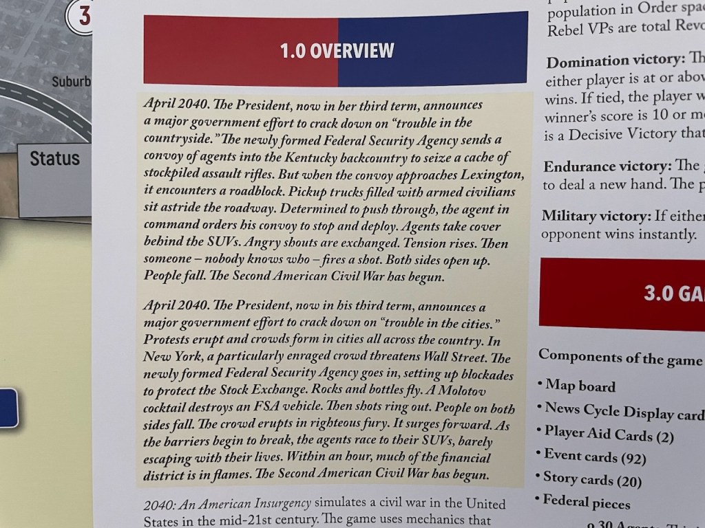 In the interview with The Player’s Aid, the designer of 2040: An American Insurgency claimed, “The game doesn’t tell this backstory, it begins when the shooting starts.” Section 1.0 Overview, however, reveals two different “road to war” scenarios: