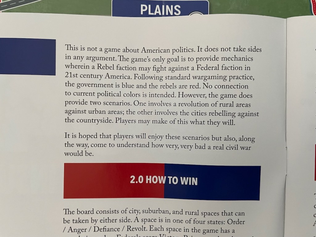 “The game’s only goal is to provide mechanics wherein a Rebel faction may fight a Federal faction in 21st Century America.”