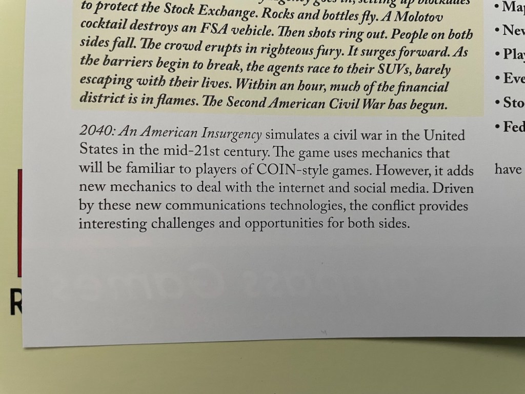 Before I look too deeply at this new game, I reviewed some of the other games in my collection that—because I own and play them—apparently made me one of those “people who fantasize political violence in the USA” long before 2040: An American Insurgency landed on my shelves.