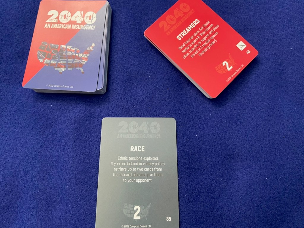 2040: An American Insurgency simulates a civil war in the United States in the mid-21st century. The game uses mechanics that will be familiar to players of COIN-style games. However, it adds new mechanics to deal with the internet and social media. Driven by these new communications technologies, the conflict provides interesting challenges for both sides.