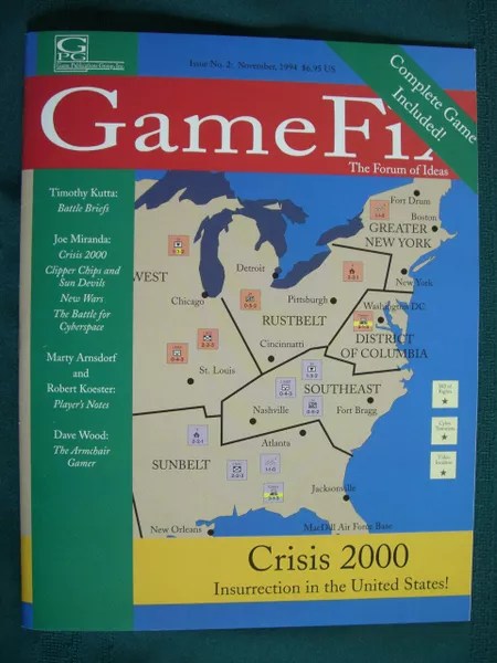 The second “American Conspiracy” wargame in my collection is Crisis: 2000 by Joseph Miranda and published in Game Fix magazine in 1994. So how was Crisis: 2000 received nearly three decades ago? Here are distinguished wargame designer Brian Train’s thoughts in a 2004 review found on BoardGameGeek: