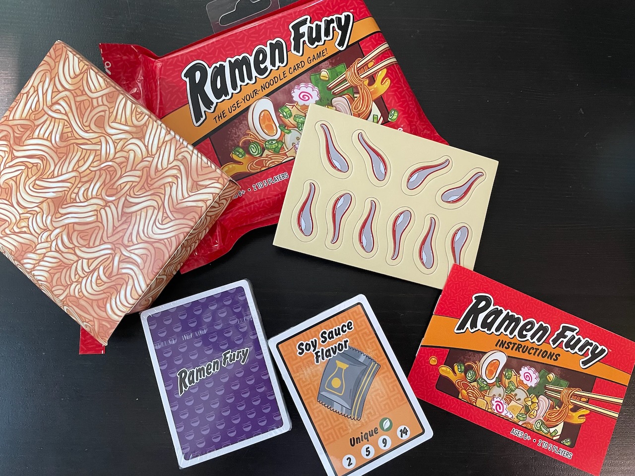 Ramen Fury stands out because of the packaging. Looking very much like a bag of uncooked ramen on the shelf, one cannot help but smile. Not only does the game look like a bag of ramen, it even feels like it when hefted. The ramen packaging theme continues inside the box resealable bag with an inner box that looks like that block of uncooked ramen. The game components—bowls and ingredient cards along with little punch-out spoons—have artwork that reminds me a bit of Sushi Go. Unfortunately, the great thematic execution of the packaging is as good as the game gets.