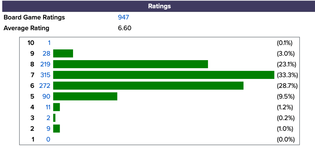 With Ramen Fury I now (much to my shame) have five Prosper Hall titles in my stomach collection, none of which I rank higher than a 5 (“Average game; slightly boring, take it or leave it”) on the BoardGameGeek ranking scale. For comparison, my overall rating average is 6.60 for 947 games making every Prospero Hall title “below average” and in the lower 12% of my collection.