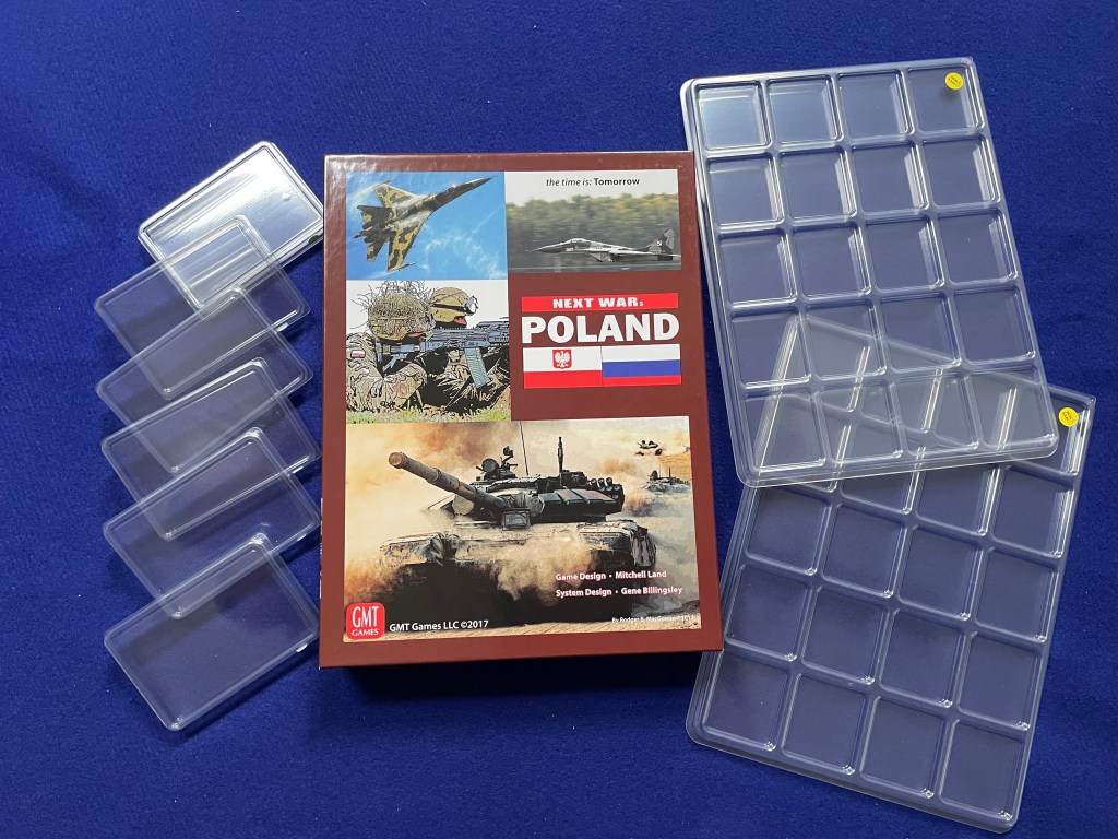 I will admit that this set, retailing at $9.36, doesn’t look favorably priced as compared to a set of GMT Games counter trays (20 compartments with lid) that sells—when in stock—at $20 for 10 trays. That said, I really like the all-clear material of the Cube4Me trays that make seeing into the compartments easy. The real test looks to be my next Cube4Me set for Next War: Poland 2nd Edition where Zilla recommends eight trays—2x 8mm deep, 20 compartment trays and 6x Standard USA playing card size, 10 mm deep trays. We will see!