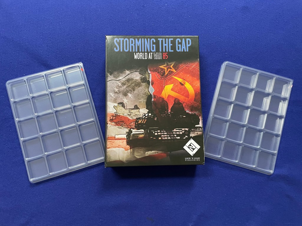 Cube4Me sells a Wargame Tray Set for World at War 85: Storming the Gap that was arranged by Zilla Blitz and consists of two (2) 15mm deep, 20 compartment trays with lids. When I first looked at the number of counters and “only” 40 compartments, I was doubtful. But if Zilla Blitz says it works I should have faith…