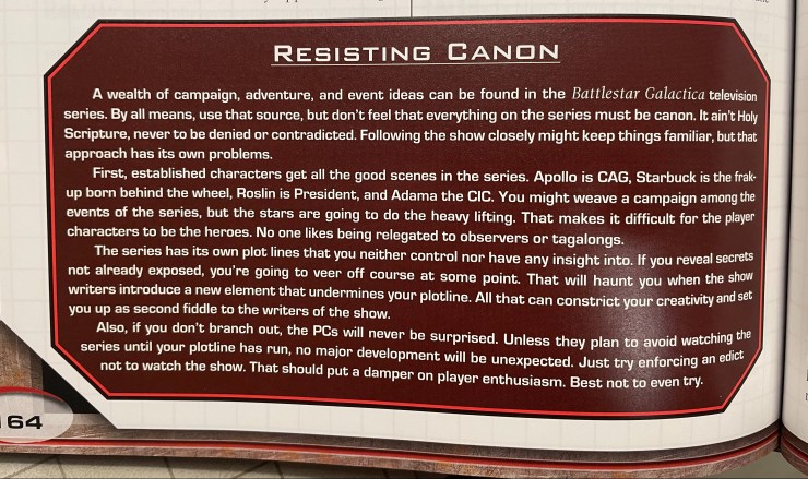 The BSG RPG released the year after the Adama Maneuver aired. It is interesting to see how the writers of the RPG advised GMs and players to “resist” canon. The “default” setting of the game basically used the events of season 1 but nothing beyond that was in the book which further encouraged the GM and players to strike out on their own.