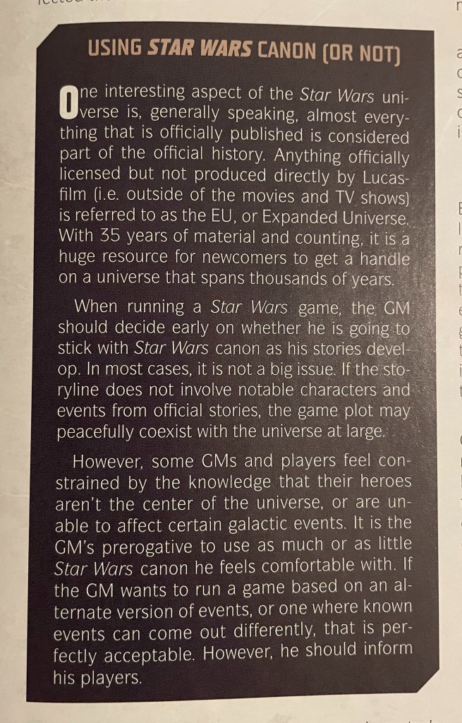 Different roleplaying games, especially those based on a popular IP, occasionally comment on the issue of canon. As I look back at my collection, here some different ways canon was addressed.