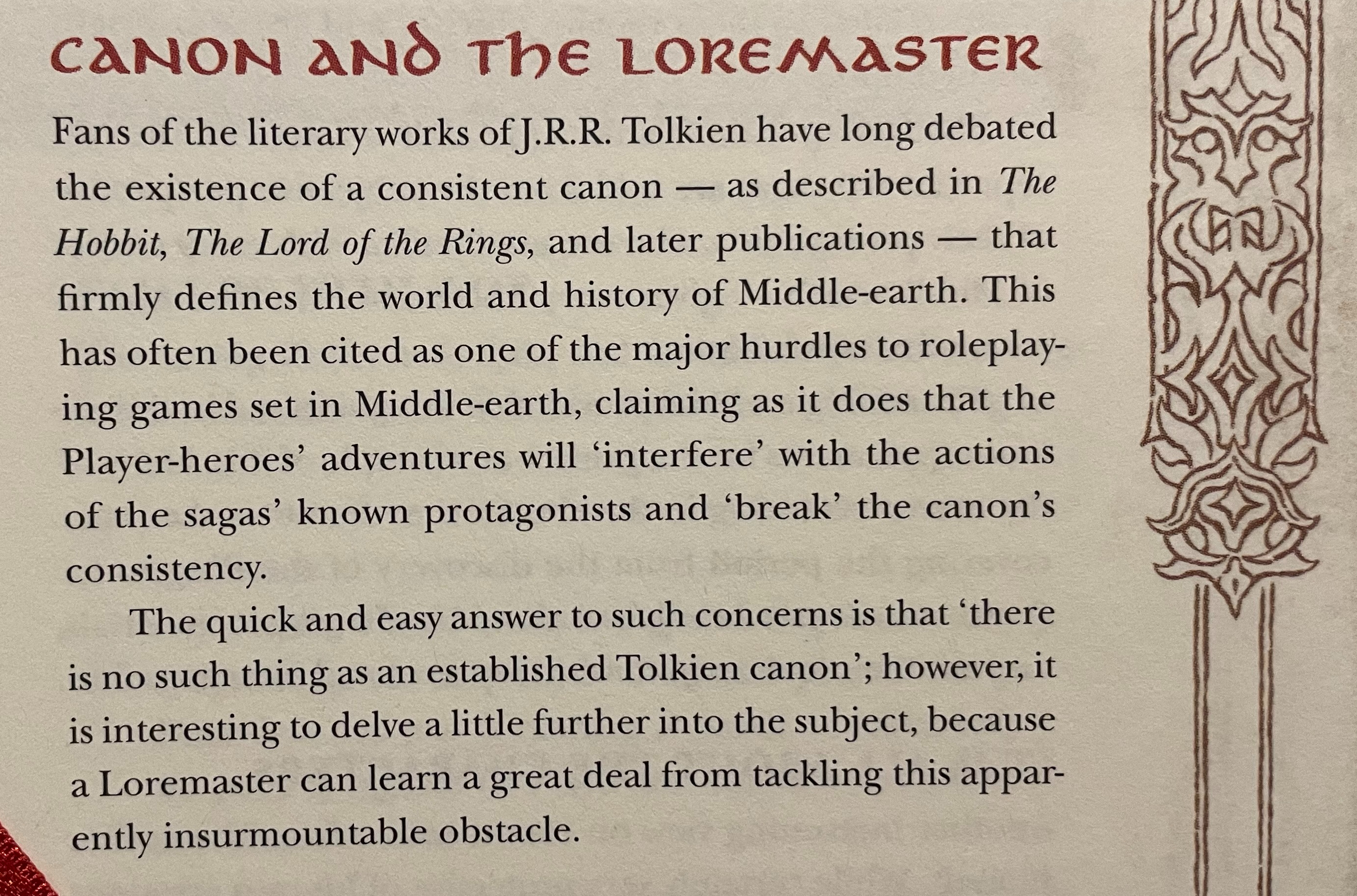 I recently wrote about my concerns playing The One Ring RPG given my lack of Tolkien fandom background. Seeing comments by the writers of the RPG that acknowledge that canon has no one definition or agreed upon version is reassuring and encourages me to strike out on my own to create my own adventures.