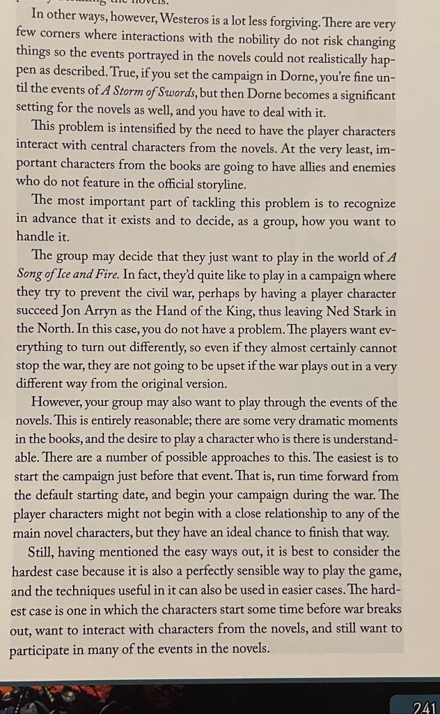 Published in 2012, this guide came out after the first season of the Game of Thrones television series aired but is based mostly on the books which I hadn’t (and still haven’t) all read. Like the BSG RPG before it, the guide takes an interesting approach to the setting where the default storyline “begins” during the events of Season 1.