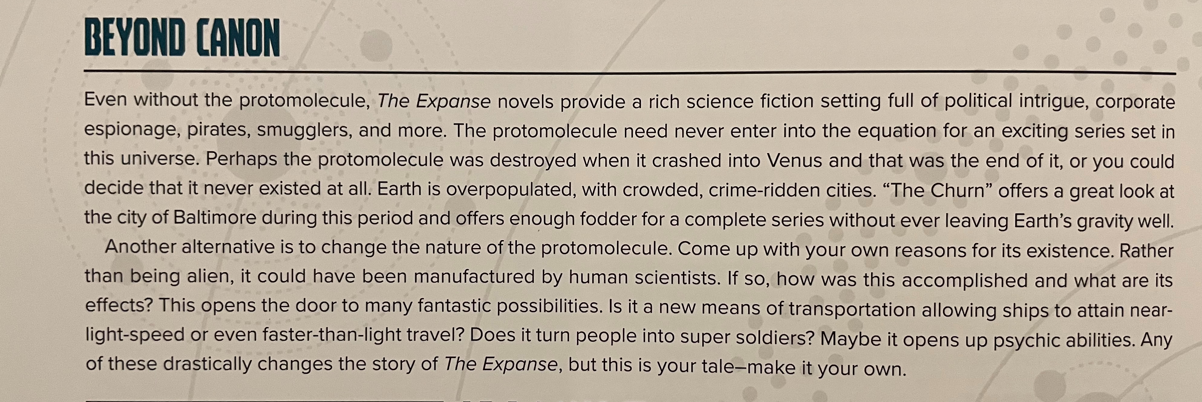 I personally was late to The Expanse not getting into the IP until season 1 of the television series. The RPG is based on the books with the “default” setting in Leviathan Wakes. I went off and read the first several books and visit this game occasionally. When I do, I certainly make it my own.