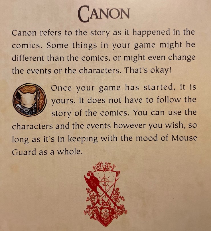 I read the Mouse Guard comic book series and loved them. I took in the Mouse Guard Roleplaying Game but, honestly, never really got into the Burning Wheel System. Since Mouse Guard was not as well known by my other players “breaking canon” was easy, all the more so since—at the time—the entire setting was built around only a handful of comic books.