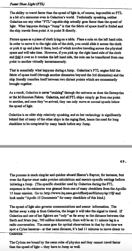 Long ago, I acquired a poor copy of what is alleged to be the Battlestar Galactica Series Bible3 written by producer Ronald D. Moore and dated 12/17/2003. Reading below, one can see the Moore’s references to the FTL differences from Star Trek and Star Wars, but the “fact” a ship can jump within an atmosphere is never explicitly stated—nor is it excluded.