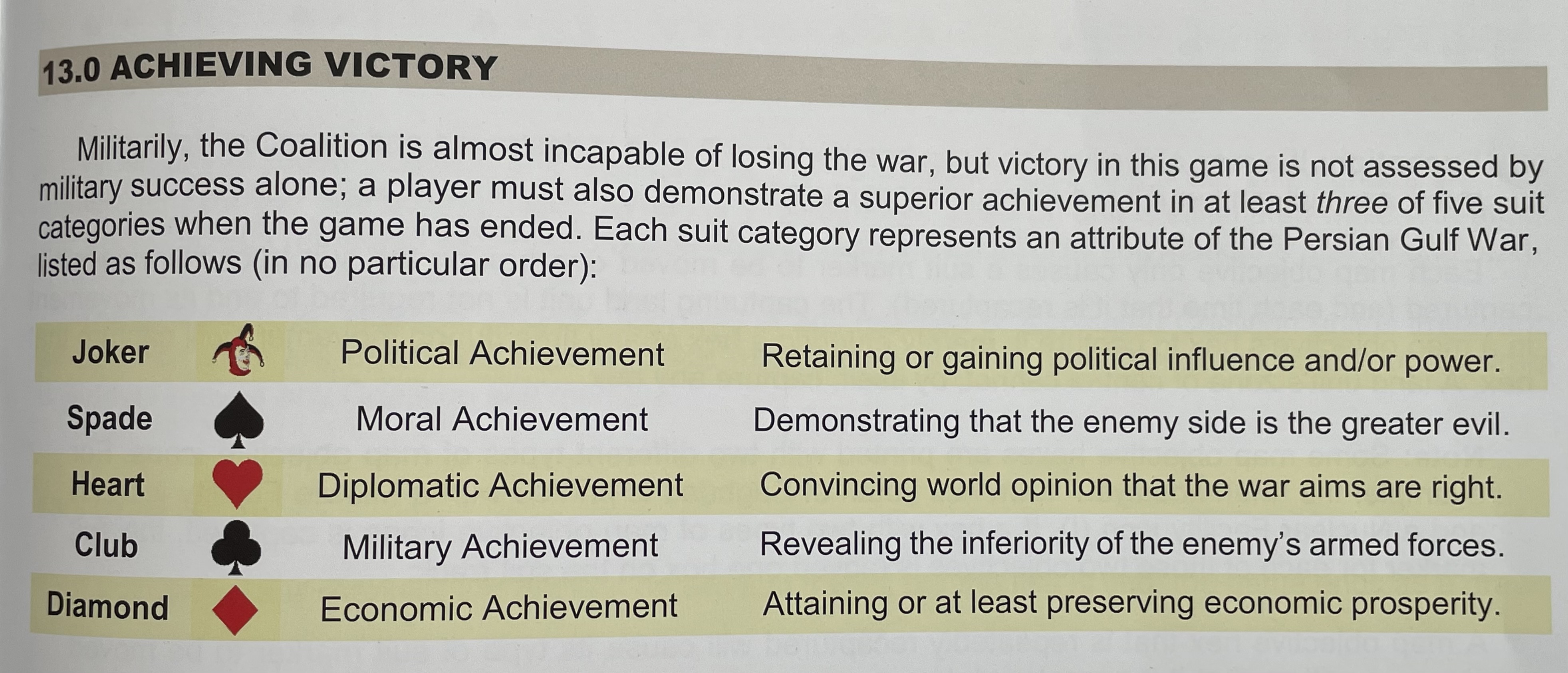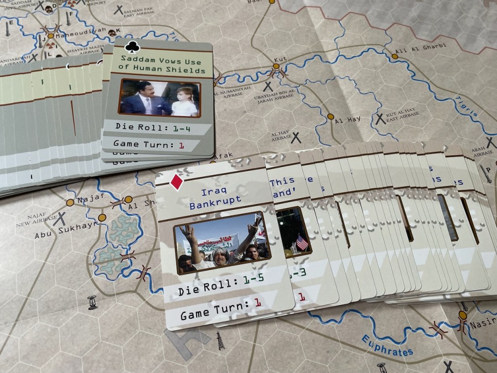 Where Desert Storm: The Hundred Hour War is decidedly NOT a traditional wargame is in determining victory. Instead of accumulating victory points, players play for suits. No, not suits to wear but suits on playing cards which are called Event cards in Desert Storm.