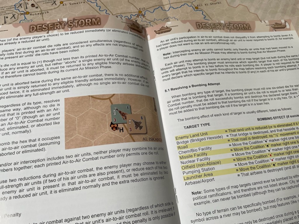 When Accurate Simulations says Desert Storm: The Hundred Hour War is a “traditional wargame” they really aren’t kidding. The game is very hex & counter with stacking rules (two friendly units max, see 4.1 Land Stacking and 4.3 Air Stacking) and a turn sequence including a very traditional Air Phase (Mission-Return to Base)-Move-Fight-Advance-Refit sequence (see 5.0 Sequence of Play). Air combat is a simple roll-under-or-equal to hit (7.1 Resolving Air-to-Air Combat) which is the same basic one-die resolution mechanism used for Bombing (see 8.1 Resolving a Bombing Attempt). Land movement pays different movement cost per the terrain (9.0 Land Movement and 9.1 Road Movement). There is a rule for Zones of Control (see 9.2 Zones of Control). Amphibious and airmobile units are also accounted for (9.4 Sea Hexes and Amphibious Units; 9.5 Airmobile Movement).