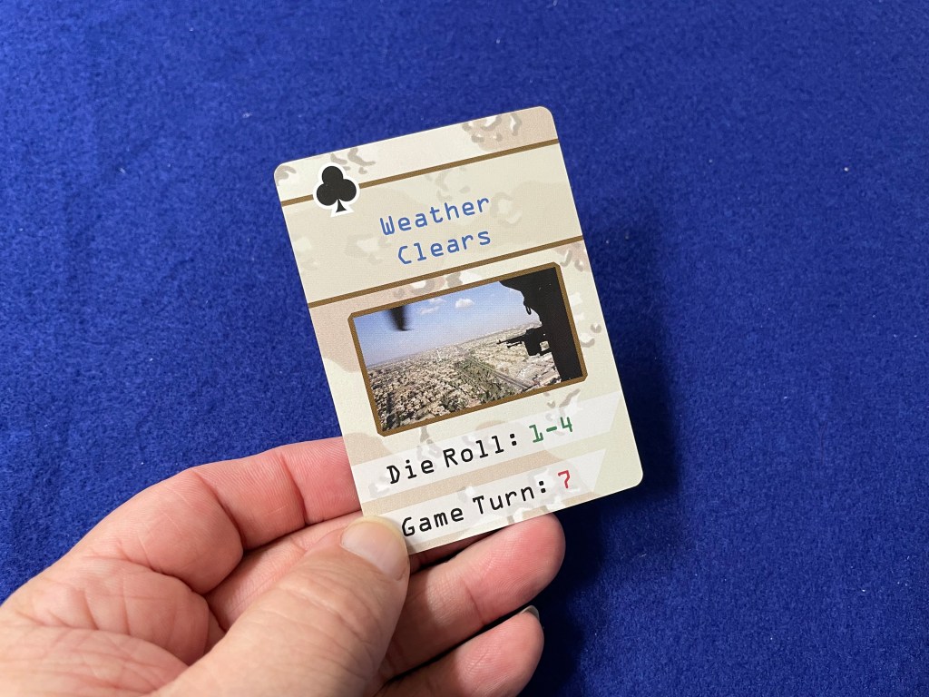 The Event cards in Desert Storm also give hints. One of the Coalition Game Turn 3 cards is “Coalition Begins Day Bombing” which was January 17, 1991. I note, however, the Iraqi Turn 4 Event card “Intense AAA Over Baghdad” seems out of sync. “Bush Declares Saddam Defeated” is a Coalition Turn 8 card but “Powell Proposes a Ceasefire” is a Iraqi Turn 9 card.