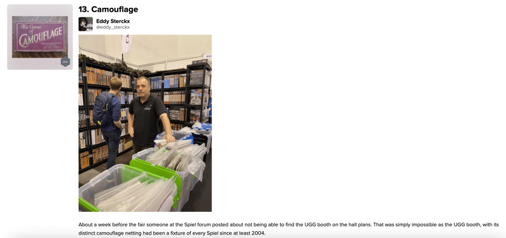 Interestingly, one of the GeekList entries covers UGG (Udo Grebe Gamedesign out of Germany) that apparently is known to longtime Spiel attendees as the booth with the camouflage netting. This year they were not present…sort of. As Eddy explains: