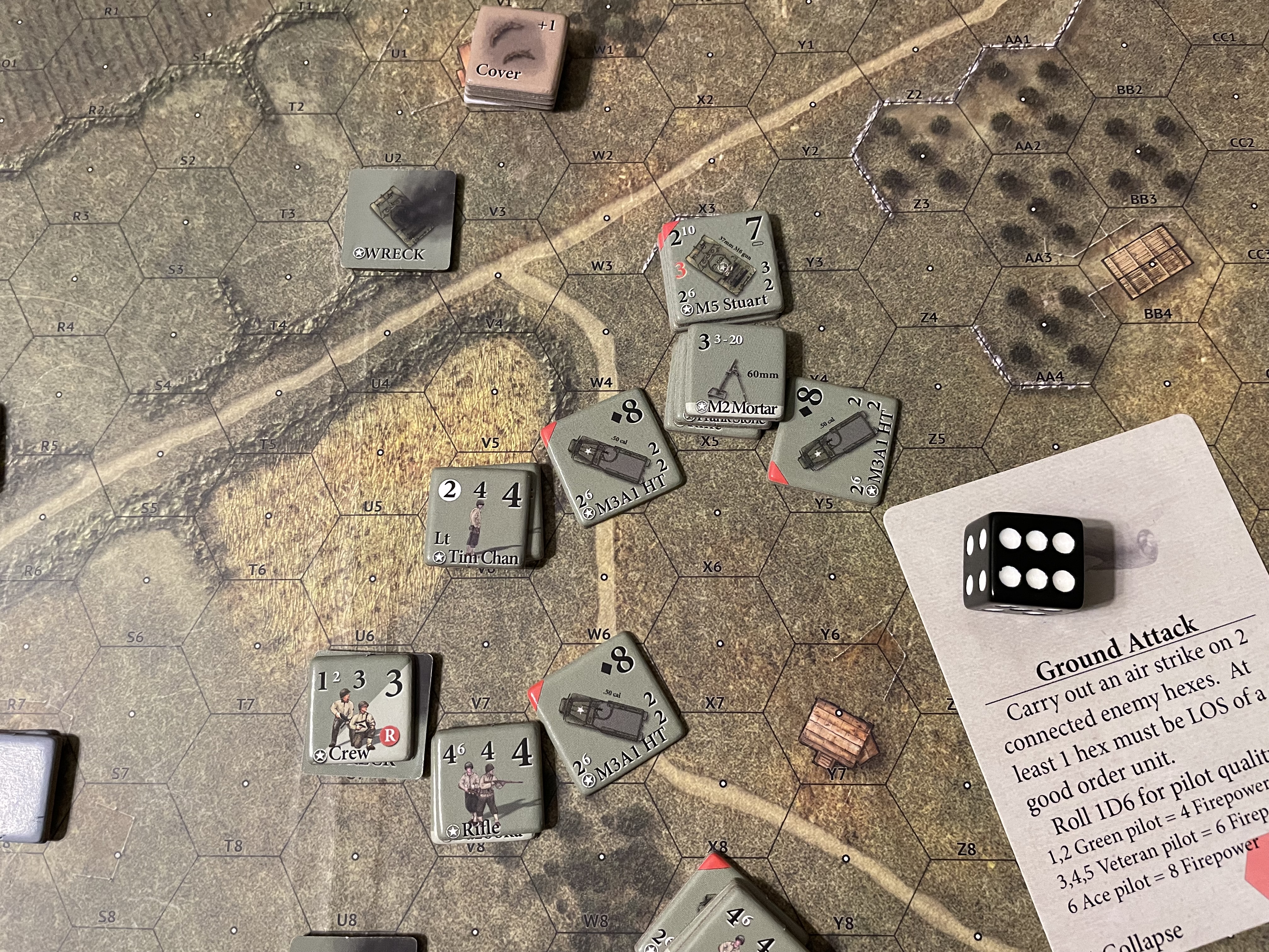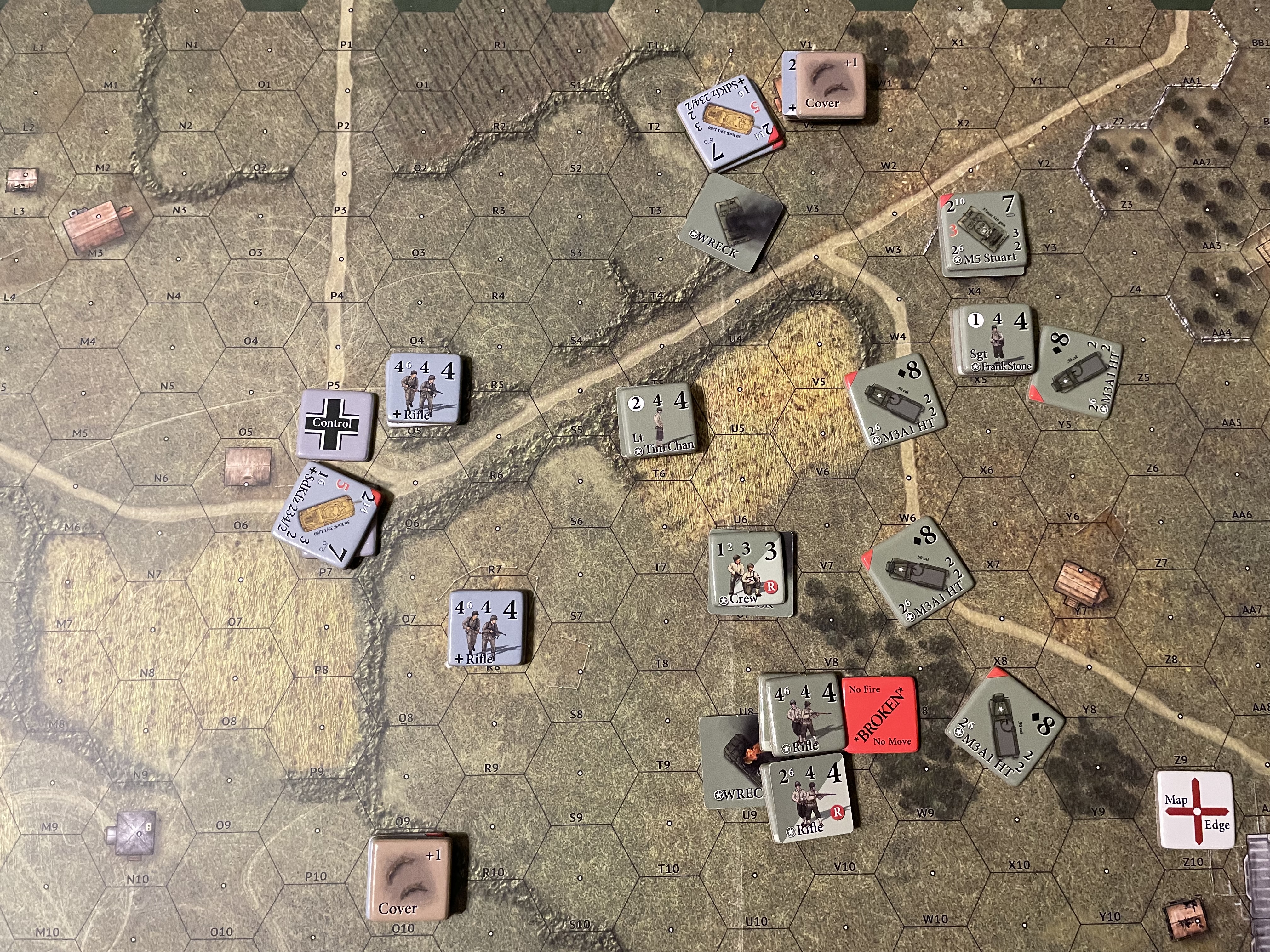 …which is exactly what happens. The German Pak40 gets two good OppFire shots and takes out an two M5 Stuart light tanks (in one tank the crew survives). A German Rifle squad dug in a small building uses a Panzershrek to (miraculously?) take out another M5. Even the Luftwaffe gets in on the action with a (rare?) air strike.