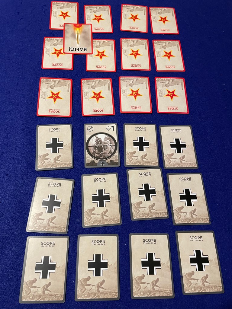 Thematically, SCOPE: Stalingrad is in many ways a simplified, card wargame version of the movie Enemy at the Gates (2001). As the back of the box states: “SCOPE is a card game in which each player controls a sniper team that must eliminate the rival sniper team and other strategic objectives, shooting wisely and changing position to not be discovered and eliminated.”