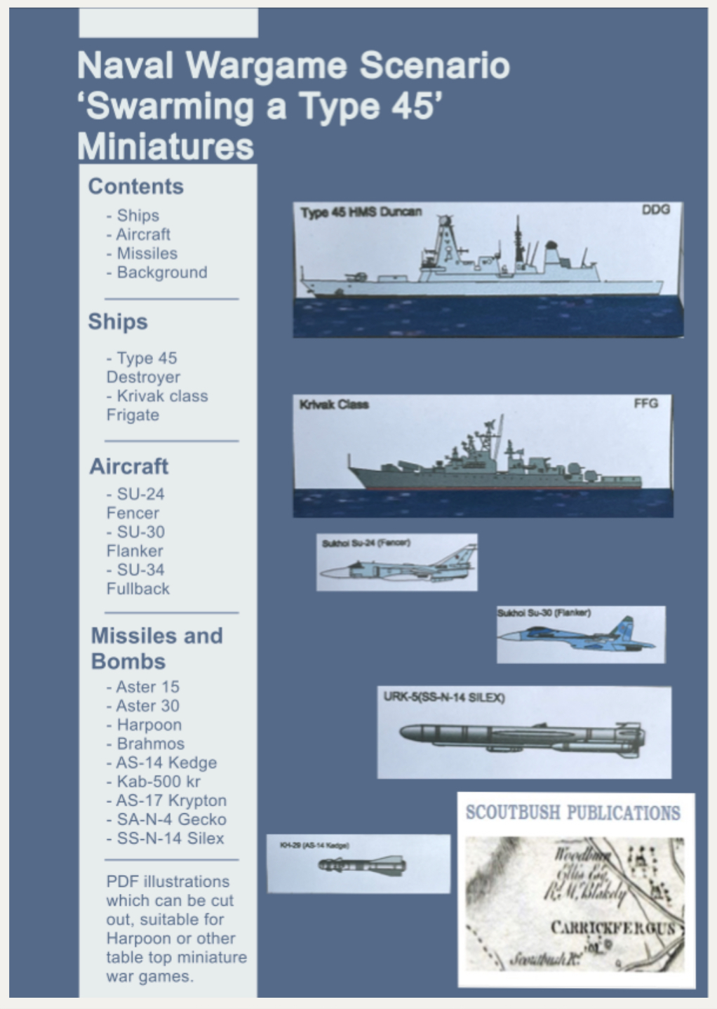 Swarming HMS Duncan: A Naval Wargame Scenario is a small digital downloadable pdf product from Scoutbrush Productions available on WargameVault for a mere $4.50. This four-page product includes paper standees for the Royal Navy and Russians for recreating the 2018 confrontations in the Black Sea. The scenario is designed for any modern naval miniatures rules but is aimed at Harpoon V (Admiralty Trilogy Group) players.