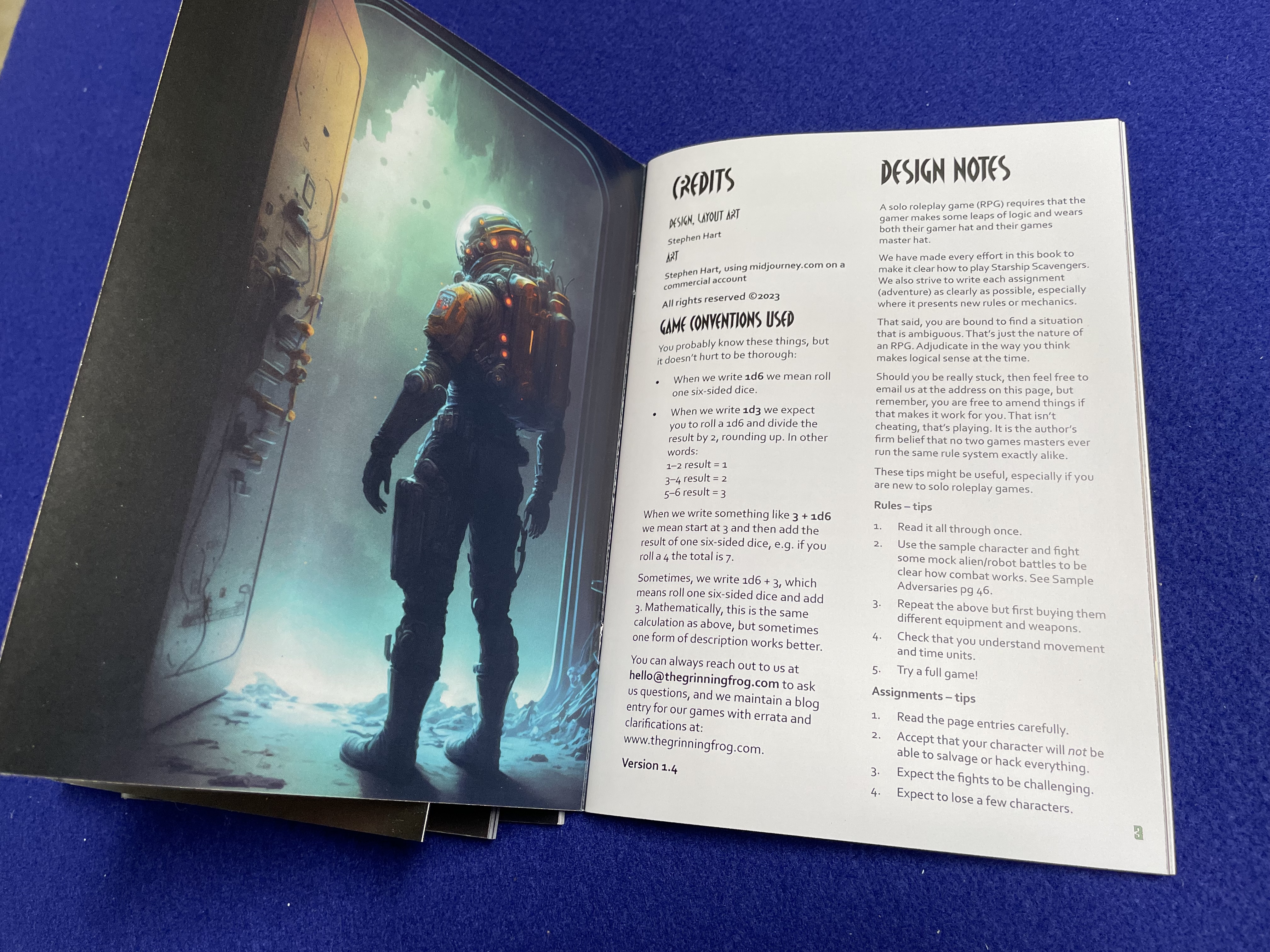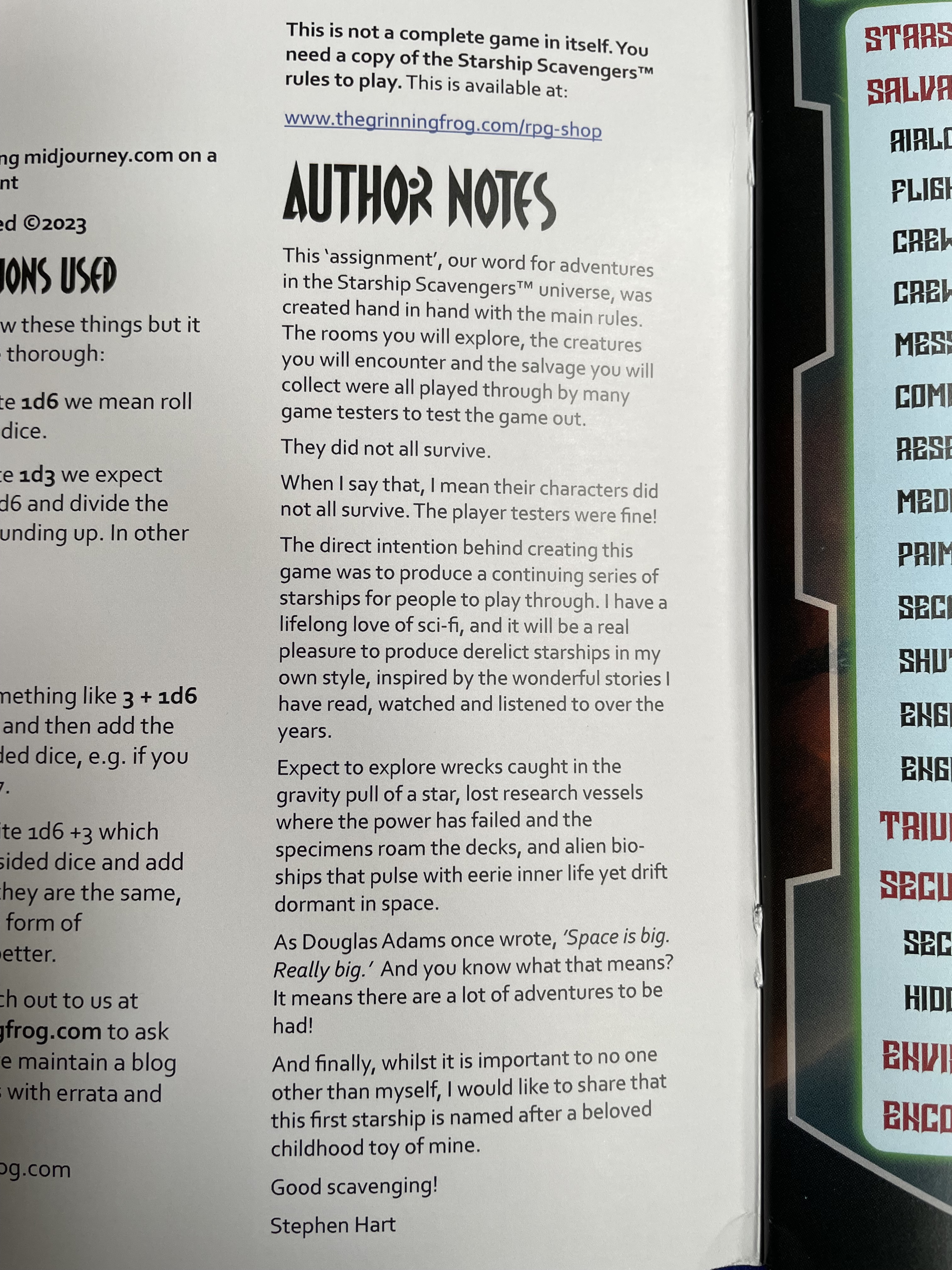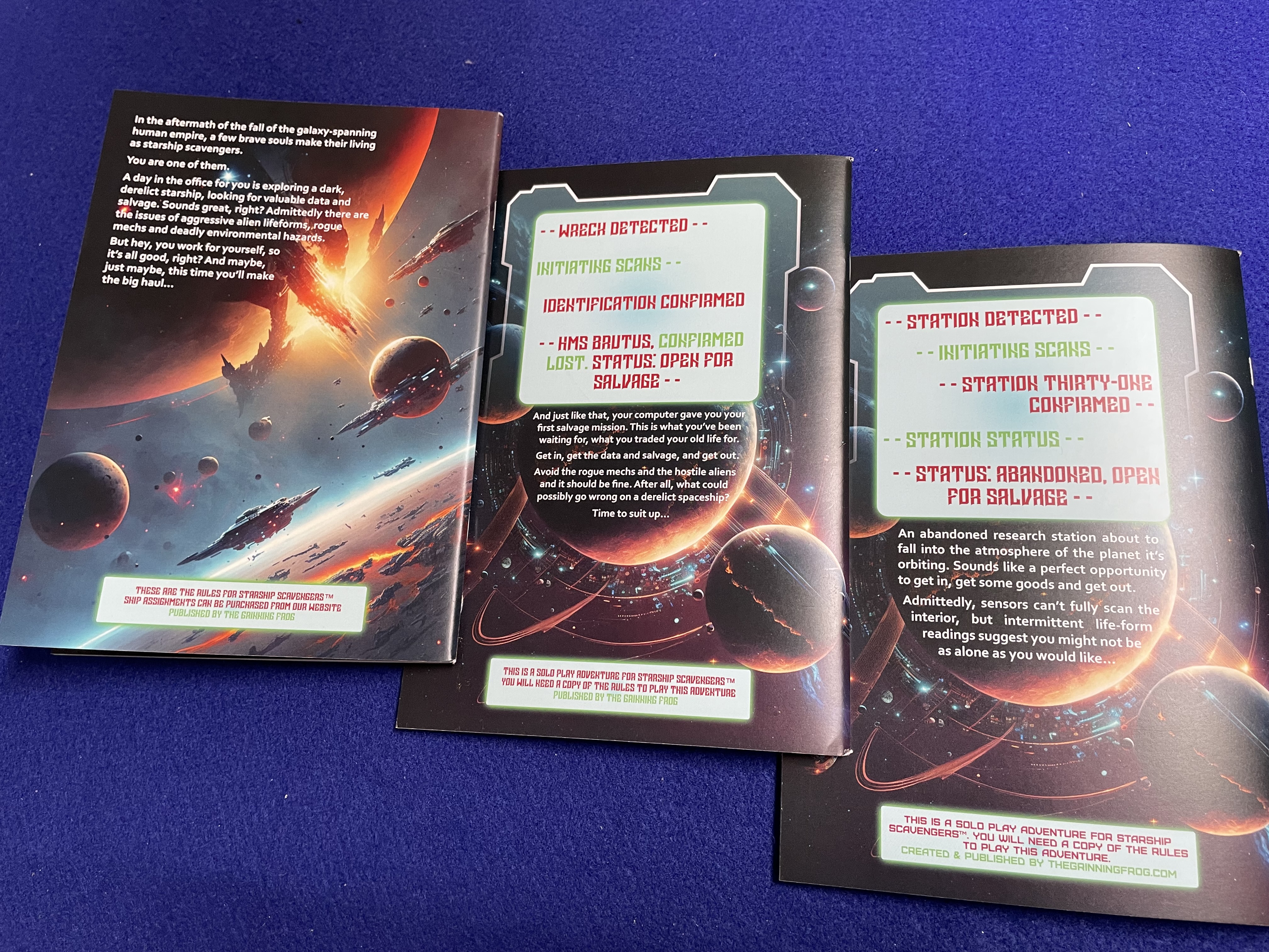In late 2023 I backed a Kickstarter campaign by a small, indie PRG publisher out of the UK with the interesting company name of The Grinning Frog. The Kickstarter was for an assignment (aka mission) for the solo RPG Starship Scavengers. I was very pleased this week when the Kickstarter fulfillment arrived.