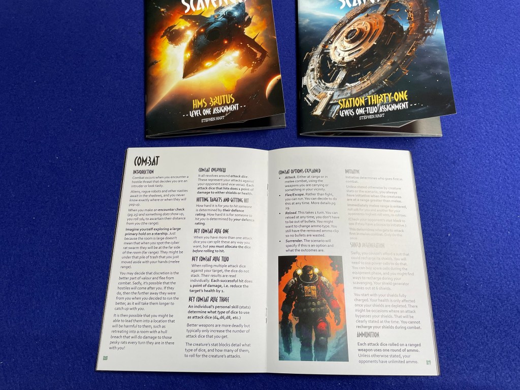 The core game is Starship Scavengers, a solo science fiction roleplaying game (RPG) written by Stephen Hart. The Kickstarter campaign not only delivered to me a digest-size rule book for Starship Scavengers but also two adventures or “assignments”; HMS Brutus: Level One Assignment and Station Thirty-One: Level One-Two Assignment along with some stretch goals.