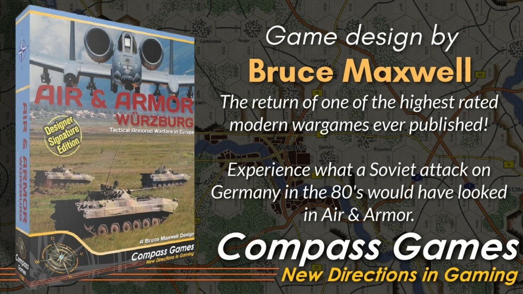 Air & Armor: Würzburg, Operational Armored Warfare in Europe – Designer Signature Edition from Compass Games via Kickstarter. STATUS – GETTING CLOSE. According to the Compass Games website the expected delivery is August 2024 but I saw a line that said shipping late June so maybe early?