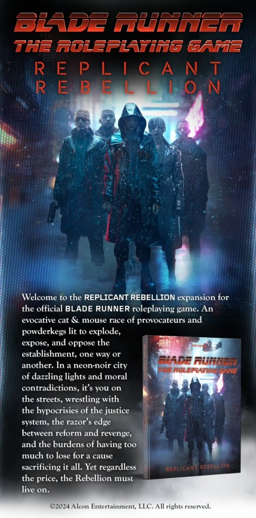 Blade Runner RPG: Replicant Rebellion & Asset Pack from Free League Publishing via Kickstarter. “Fight back against Replicant oppression in this major expansion to the award-winning BLADE RUNNER RPG from Free League Publishing.” Funded with campaign to end 13 Jun. Projected delivery February 2025.
