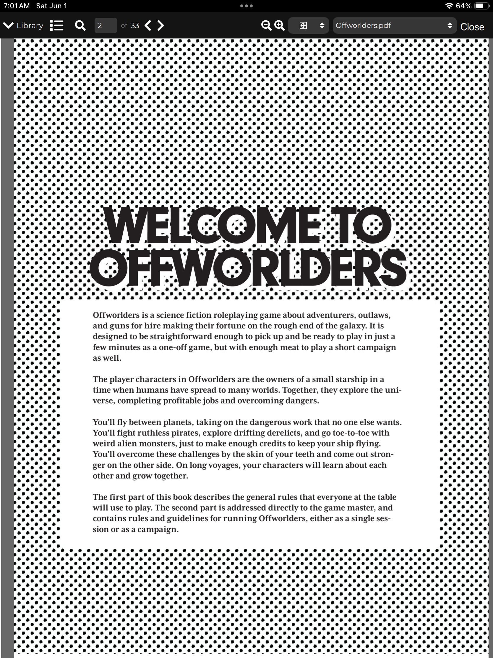 Offworlders is a science fiction roleplaying game about adventurers, outlaws, and guns for hire making their fortune on the rough end of the galaxy. It is designed to be straightforward enough to pick up and be ready to play in just a few minutes as a one-off game, but with enough meat to play a short campaign as well.