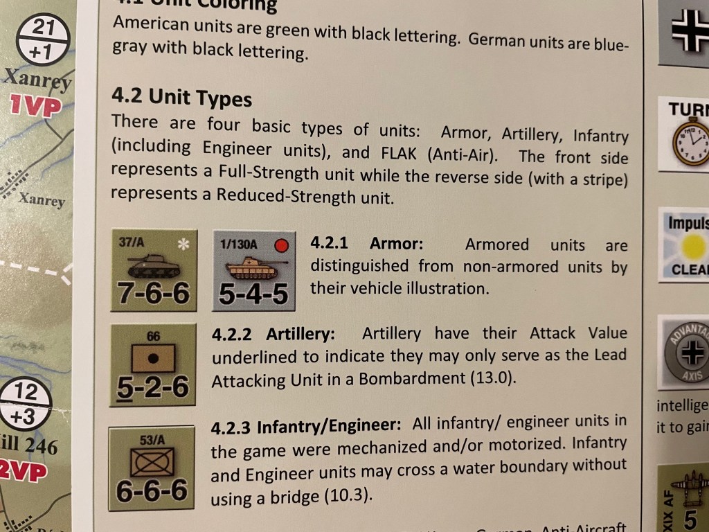 Patton’s Vanguard is a Michael Rinella area-impulse game design. The wargame depicts the Battle of Arracourt at the grand tactical scale; that is, units generally represent companies. Instead of a traditional hex & counter map the battle space is divided into areas where 1″ on the map equals roughly 0.75 miles. One turn equals full day of combat with the Daylight Phase composed of Impulses within which each side conducts an Assault, Ranged Attack, Bombardment, Regroup, or Pass action. If both sides Pass the Daylight Phase ends. On each American Phase that player makes a Sunset DR roll of 2d6; if the result is equal to or greater than the Impulse number the next impulse is played. If the Sunset DR is less than the current Impulse number the Daylight Phase ends. Additionally, if the Sunset DR is equal to the Impulse number the weather changes. Victory is determined based on area control. The game design features a few “chrome” rules such as: