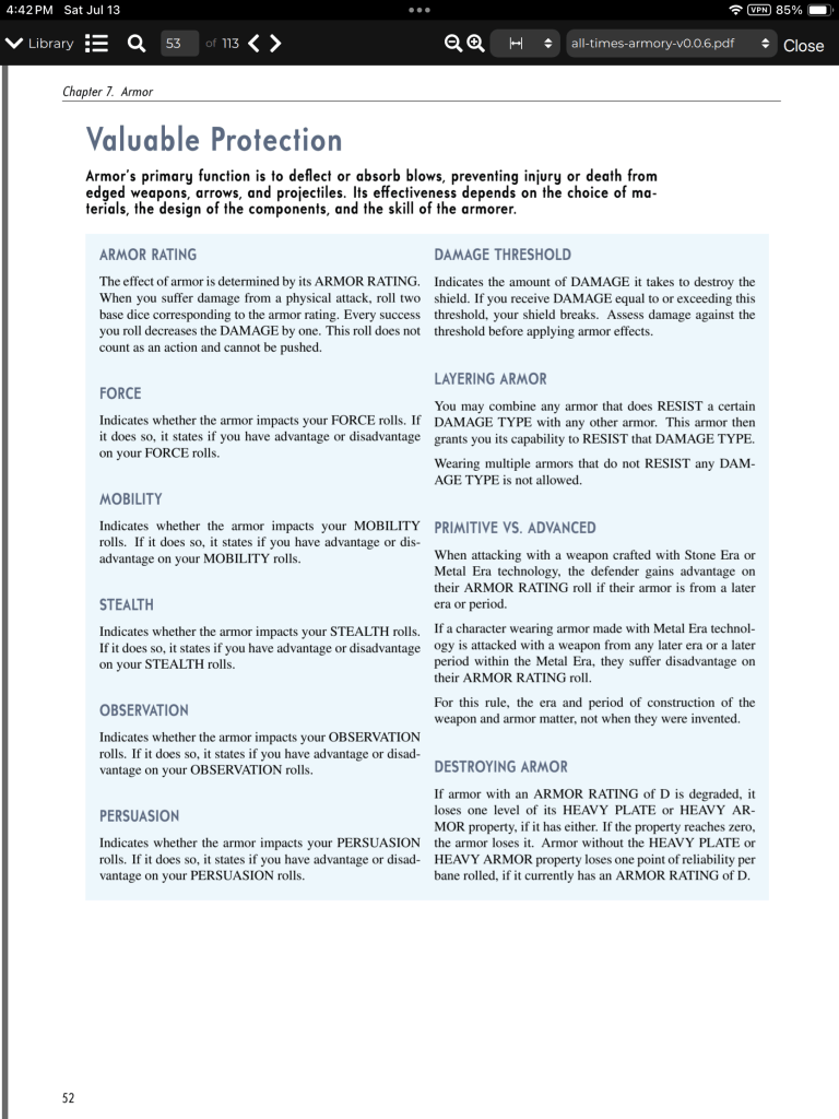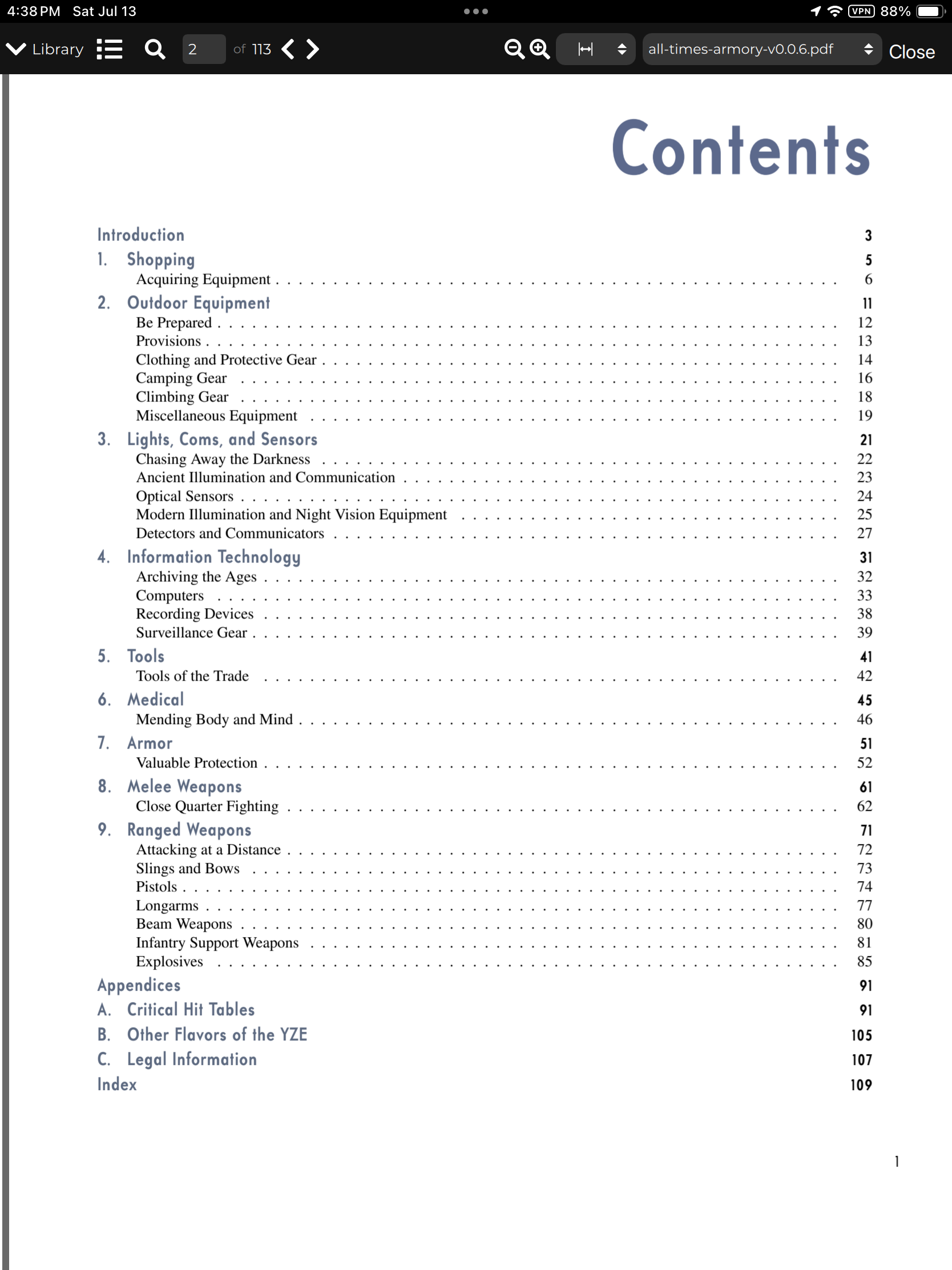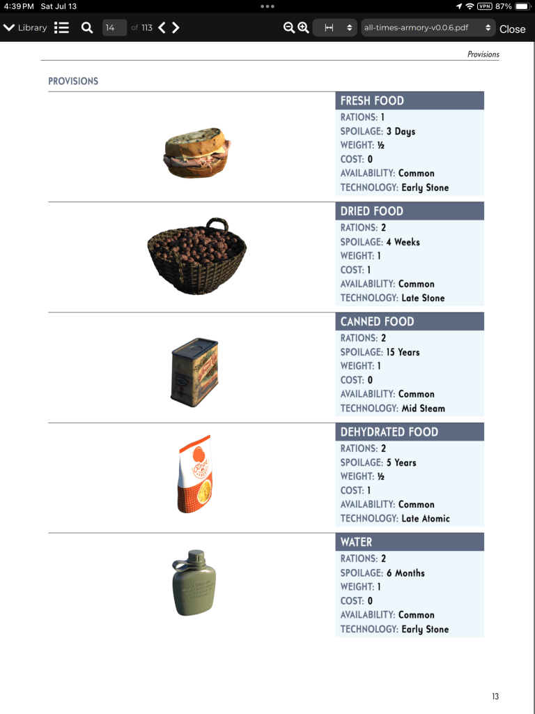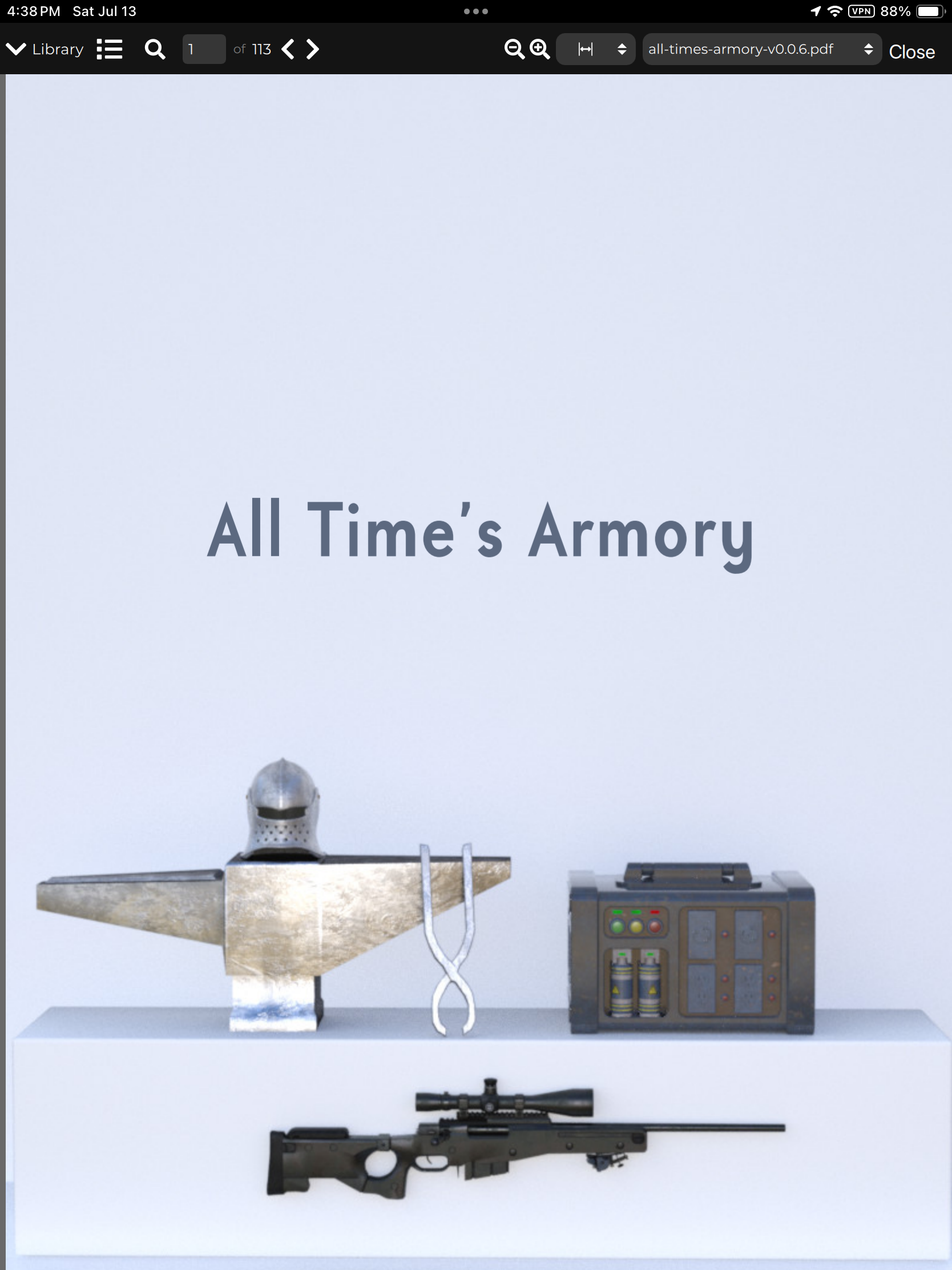 Given the broad time covered in All Time’s Armory, a Referee will almost certainly be called upon to make a determination if a particular item is useful, relevant, or even allowed in a game. Likewise, seeing as All Time’s Armory is free, players and Referees will be equally free to make those decisions themselves.