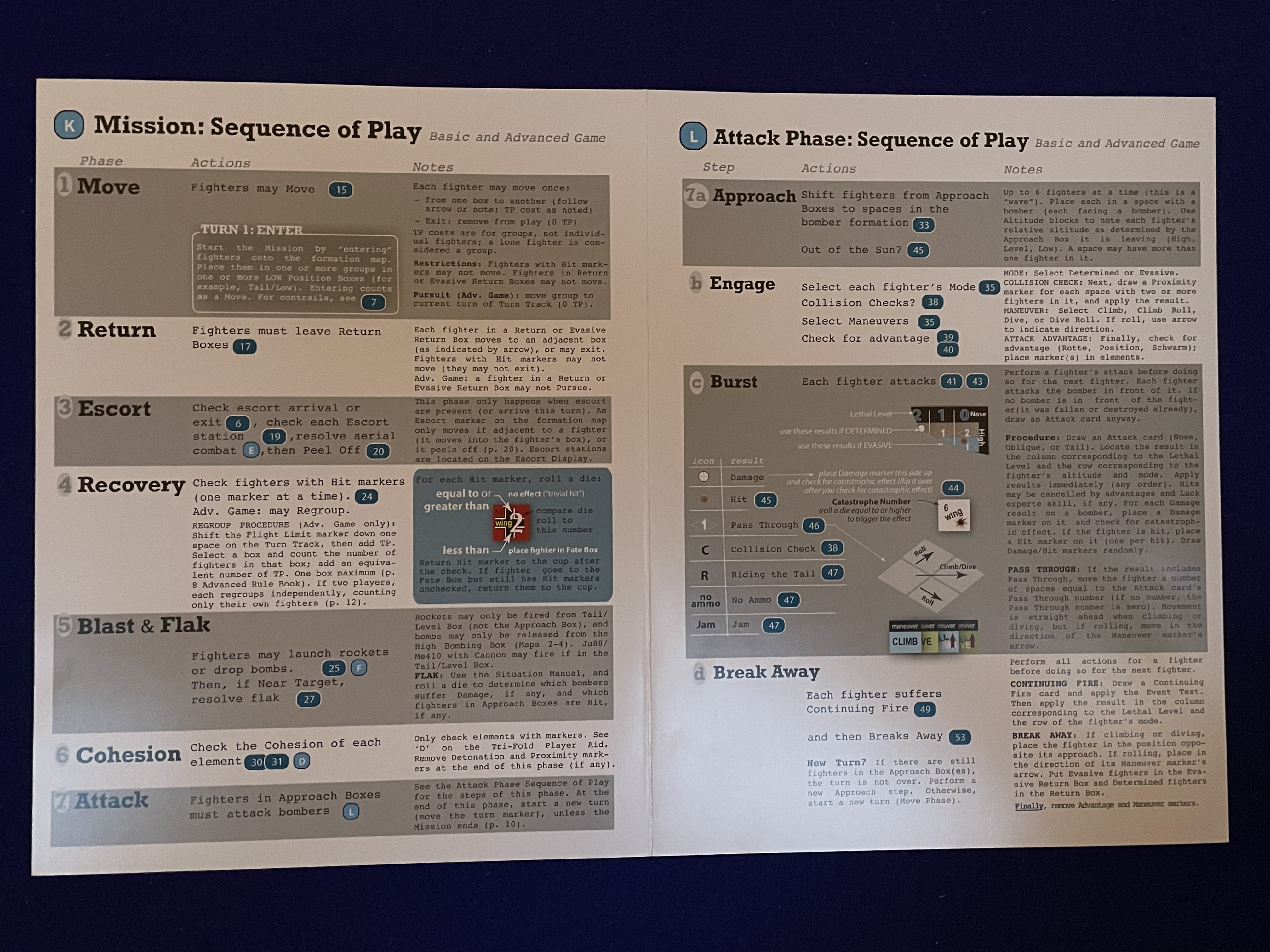 So I pulled out the double-sided tri-fold and…well, what you get is not a rule book but guided instructions on how to start playing. No, that’s not quite correct. Once a player has “perused” the tri-fold play starts using the Basic Game Instructions bi-fold which will eventually directs a player to the Mission: Sequence of Play and Attack Phase: Sequence of Play cards.