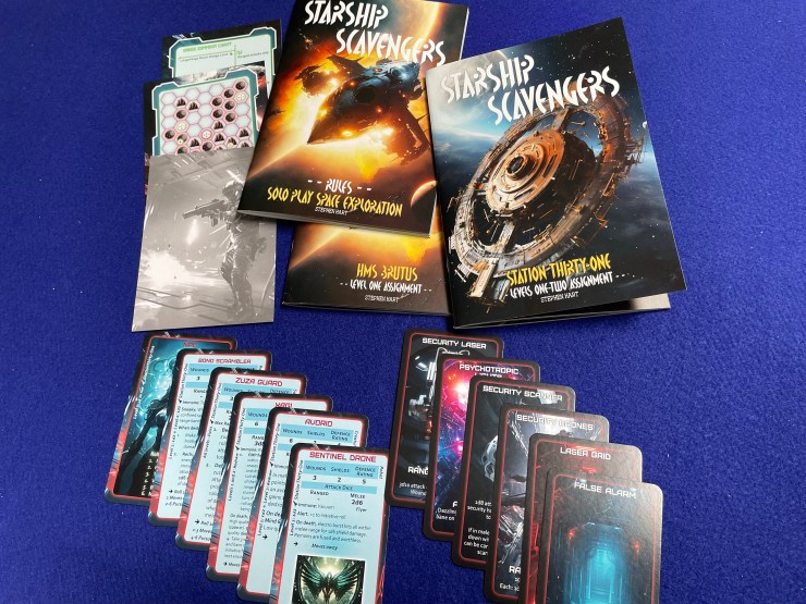 As I enjoy physical copies of my roleplaying games I purchased the deadtree version though pdfs are also available. Starship Scavengers rules and adventures are full color, saddle-stapled, digest-sized booklets usually running 48 to 52 pages in length. The Starship Scavengers core rule book (52 pages) contains setting material and all the rules needed for play; individual adventures add flavor rules for that adventure as well as the maps and non-player characters (NPCs) needed. The Kickstarter campaigns often add stretch goals of cards or other player aids to ease game play; those items are nicely produced but not absolutely necessary for play.
