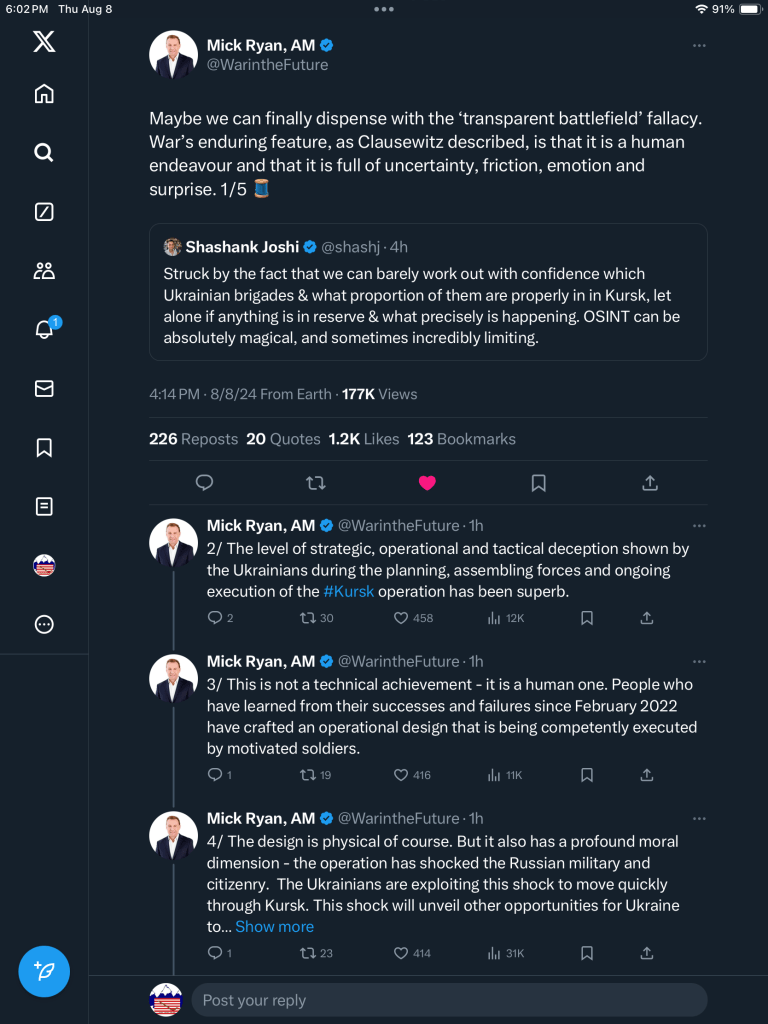 As I was reading The Arms of the Future, the Ukrainian strike into the Kursk Oblast was in the first 72 hours. With those events unfolding, it was interesting to read passages such as: