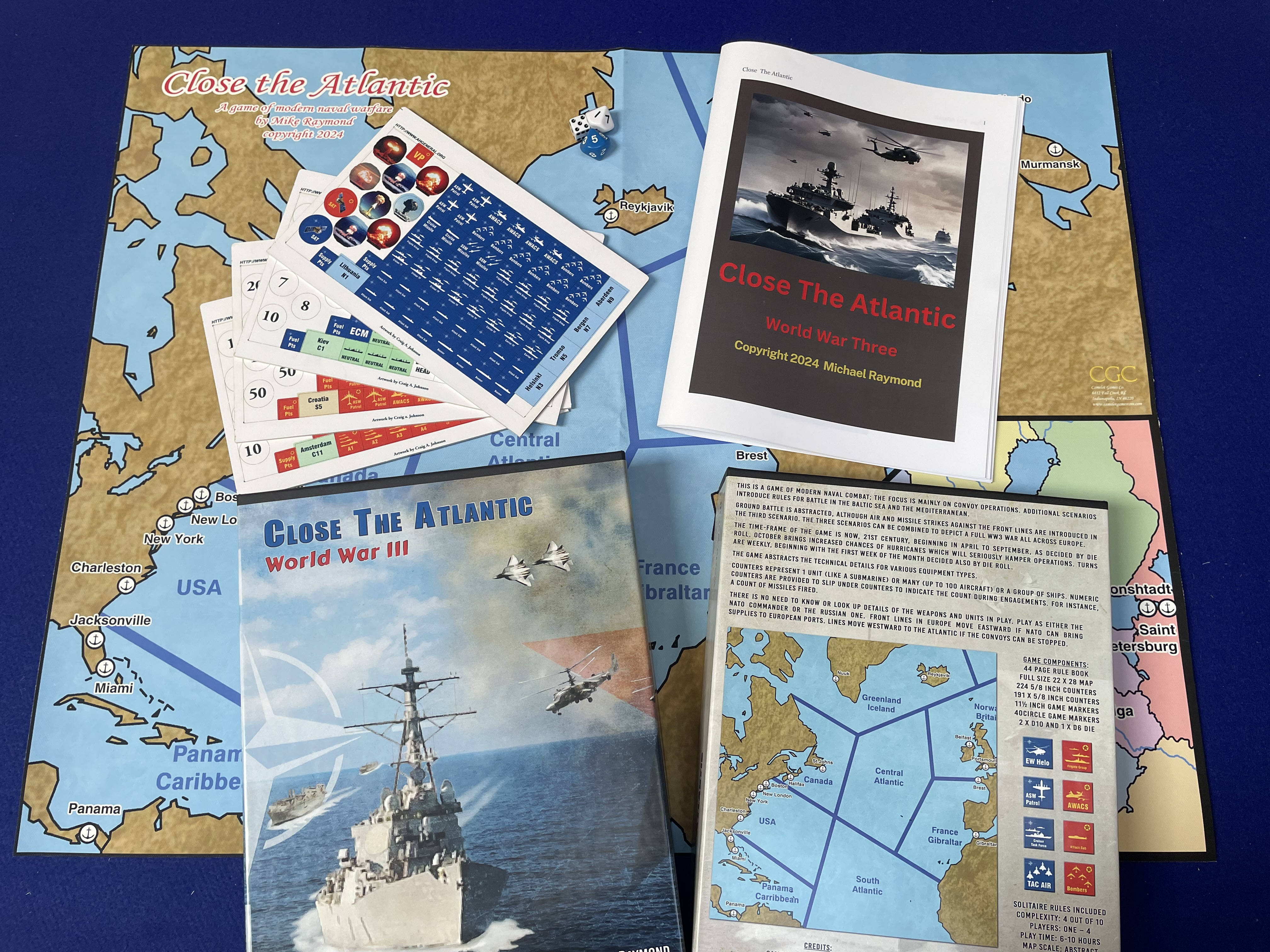 Close the Atlantic: World War Three is a self-published wargame by designer Michael Raymond. It is an interesting wargame to me. The theme in particular—the next Battle of the Atlantic—is of very high interest. The game design itself appears to be a strategic view of the conflict, not so much different in look or scale than the older Avalon Hill Victory at Sea. Taken together one gets a somewhat abstracted view of a potential future conflict in the Atlantic Ocean.