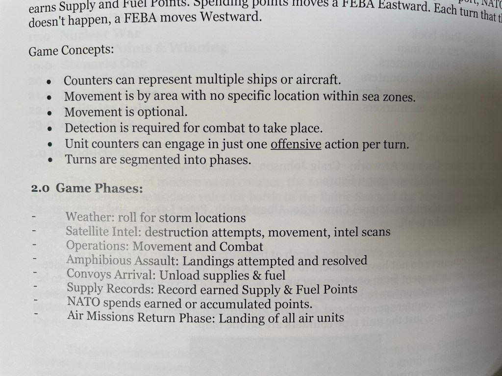 The detailed sequence of play now has seven phases—not eight like on page 4 or the nine steps on page 7. The terminology has again changed and remains different across the three different sequences of play. Further, there are some game actions that remain unclear as to when they take place. For instance, the forward edge of the battle area (FEBA) is tracked and moves based on different game events. Are FEBA moves instantaneous or are they all tracked and executed in one fell swoop? Not sure….