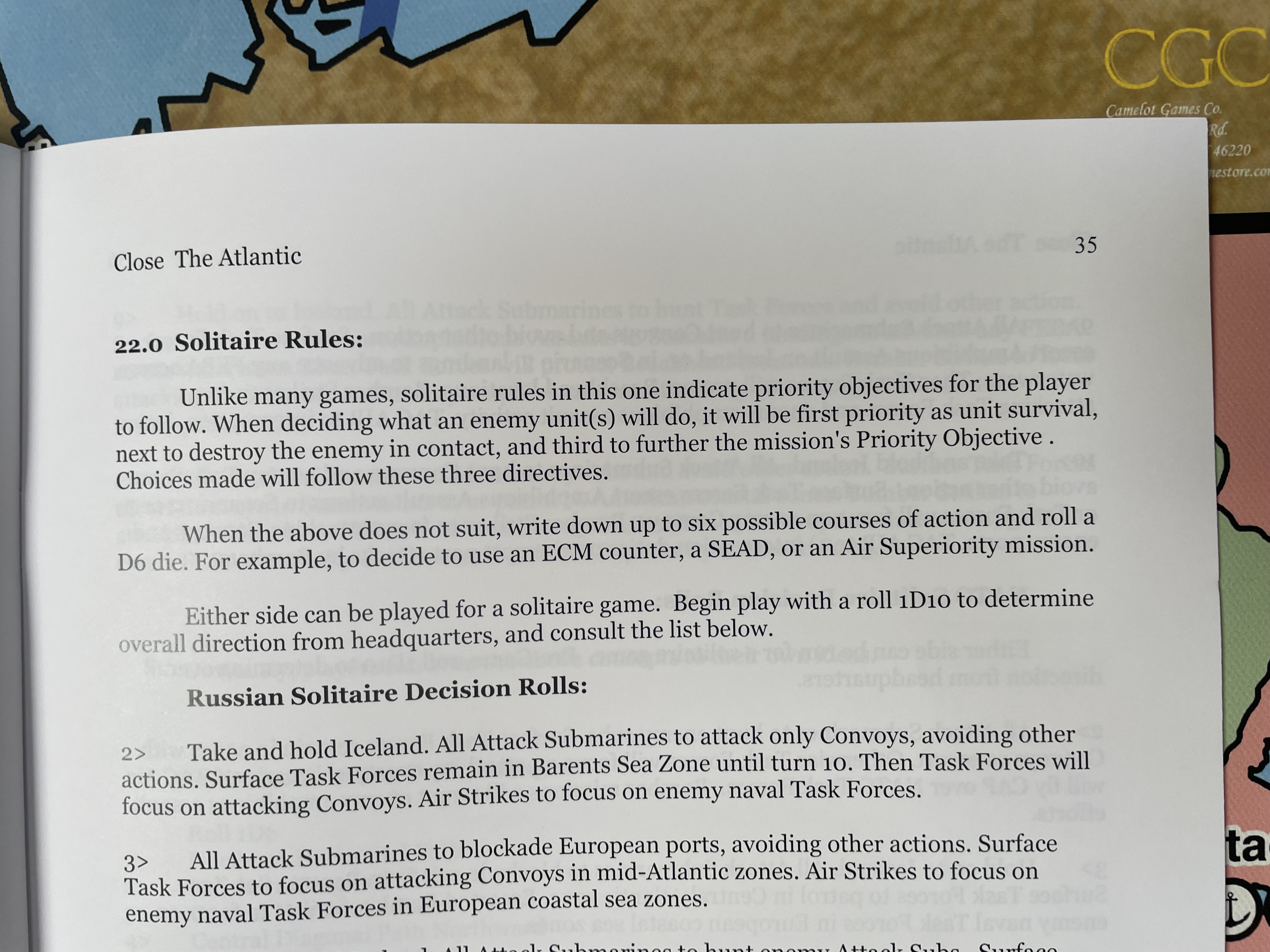 I also should mention that Close the Atlantic: World War Three has solitaire rules. The rules are not so much “rules” as they are “guidelines” for how the non-player side is supposed to be played. In practice one rolls a d10 to get the priority objectives for the game. That is a solitaire game in a sense…but a very loose one at that.