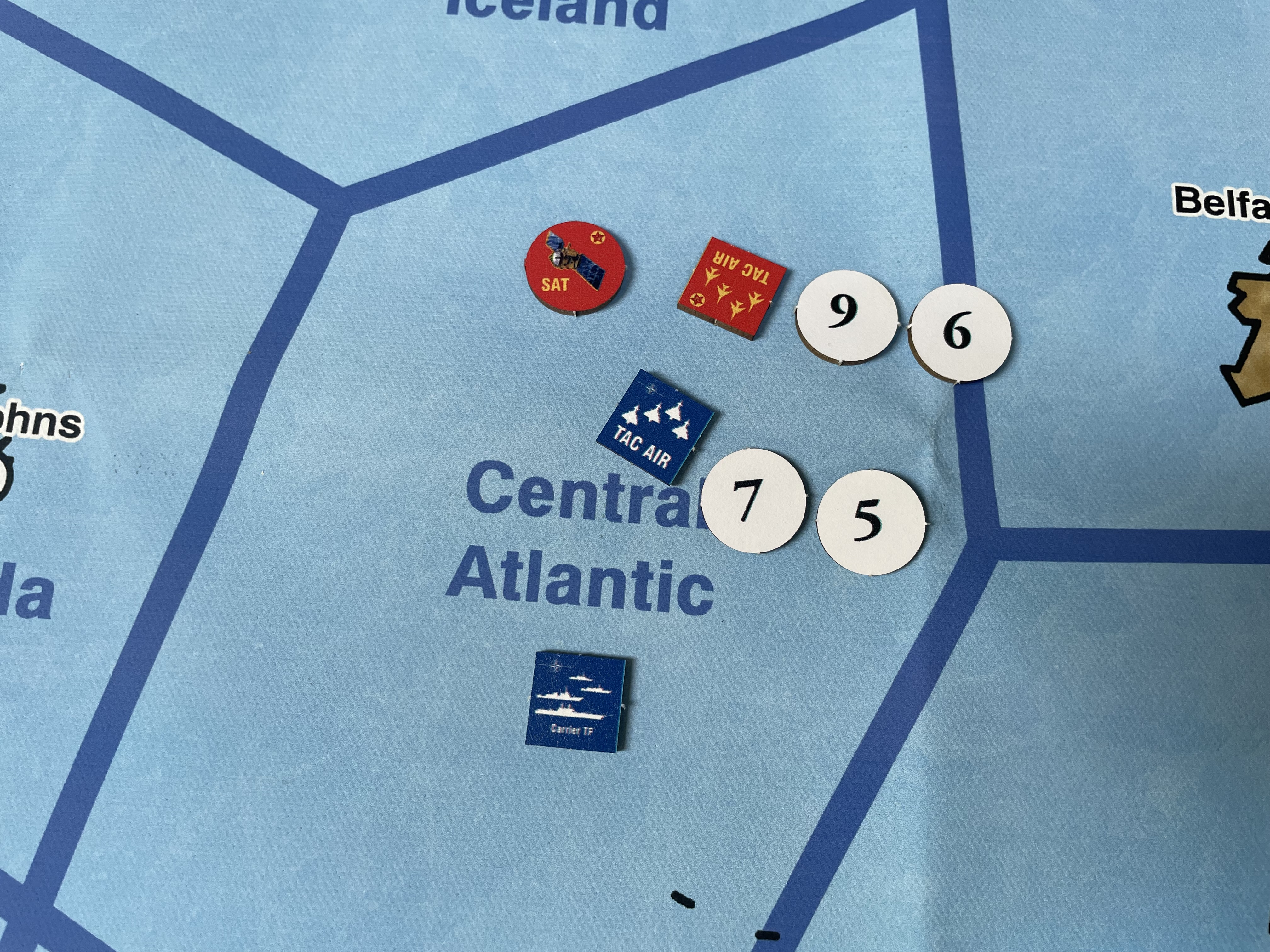 - Satellite Phase – There is a Russian satellite in the Sea Zone containing the NATO Carrier TF. This should result in a +1 to all Russian radar detections. NATO attempts to shoot down the ASAT but fails? Don’t know…the rules state, “Roll 1d10 with a ‘6’ required for success” (Rule Book, p. 6). Roll under or roll over? Other rolls generally seem to be ‘roll under’ so I assume the roll of [9] is a failure.