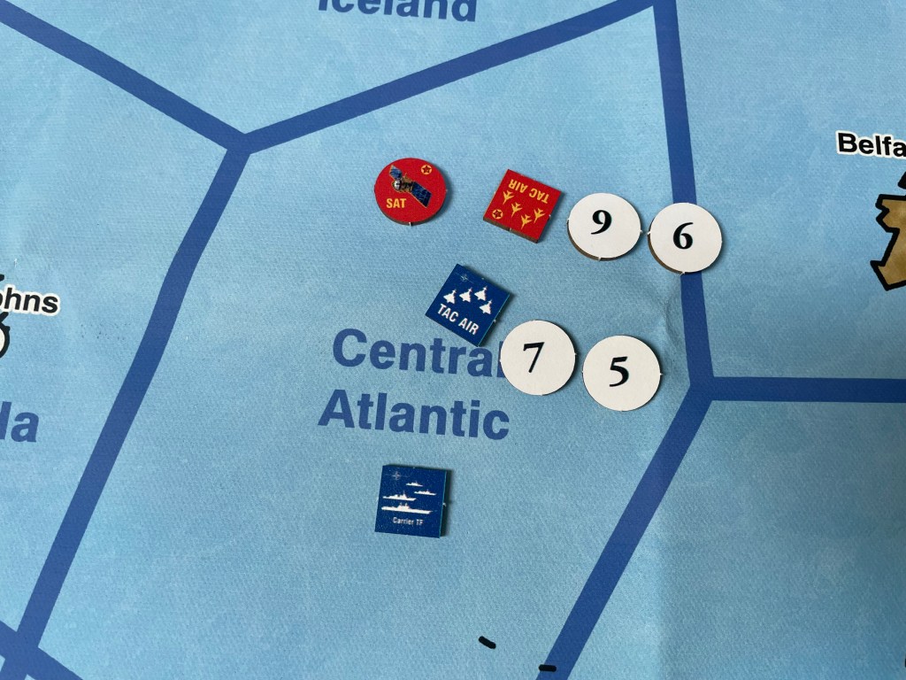 - The NATO player has one TAC AIR counter escorting the NATO Carrier TF. Or do they? I cannot find any rule in the book that says a Carrier TF automatically includes a TAC AIR counter—it is seemingly implied in places but not specifically stated. There are rules for deploying land-based air but I cannot find corresponding Carrier TF rule. I decide it makes sense to allow the Carrier TF to have a single TAC AIR counter so I do so. A random die roll reveals this is 75 aircraft each with 2x air-to-air missiles (AAM) for a total of 150 AAMs. (Rule Book, pp. 21, 23)