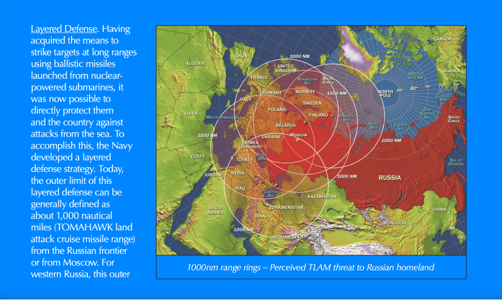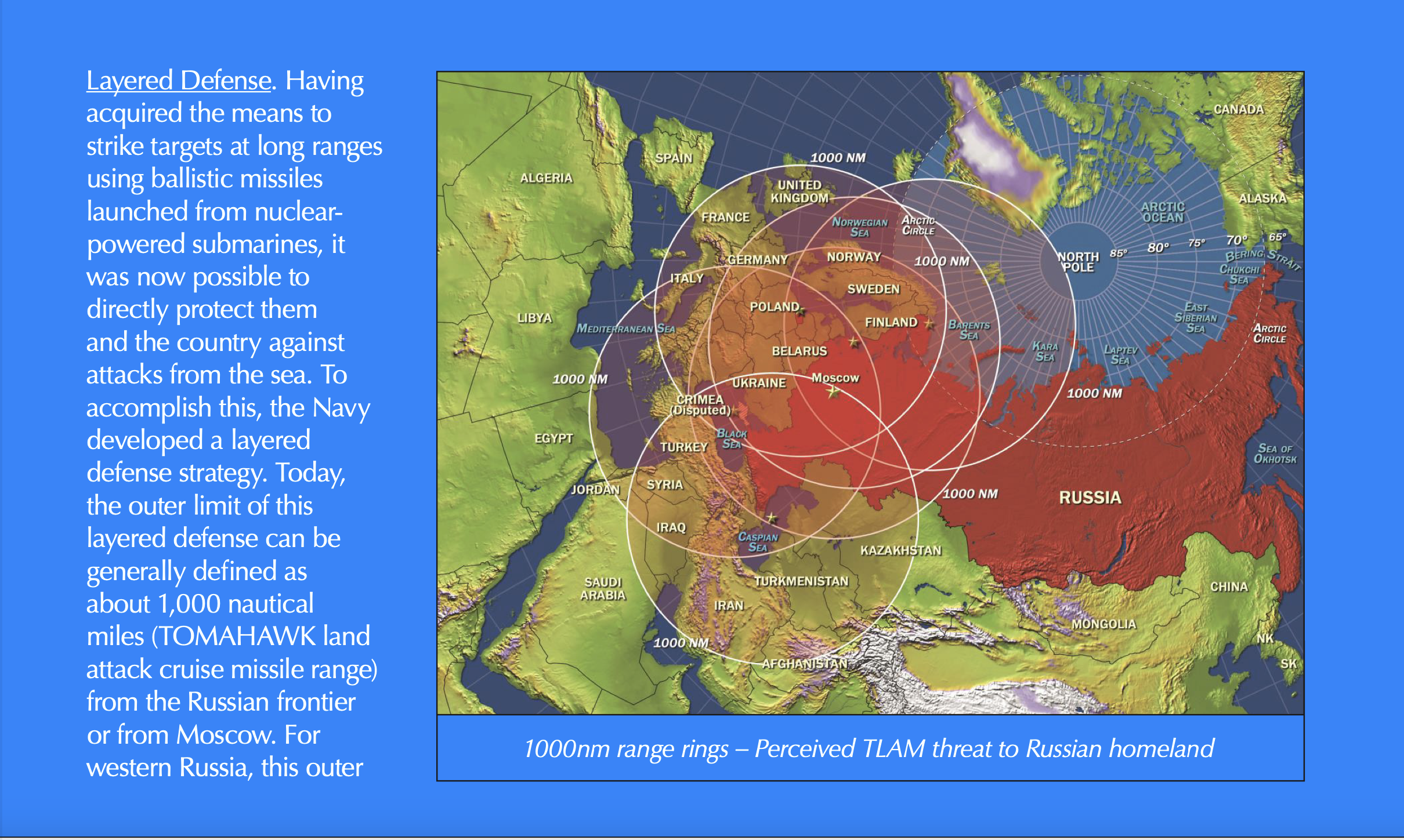 In 2021, the U.S. Navy’s Office of Naval Intelligence (ONI) published their foreign capabilities guide on the Russian Navy. Interestingly, ONI ascribed primarily a defensive mission to the Russian Navy which is responsible for Layered Defense of the motherland out to a range of 1,000 kilometers—the range of Tomahawk land attack cruise missiles. The 1,000 kilometer threat rings reach into the Norwegian Sea but not deep into the Atlantic. In Close the Atlantic: World War Three the this area is roughly the upper right quadrant of the map; the rest is beyond the threat rings.