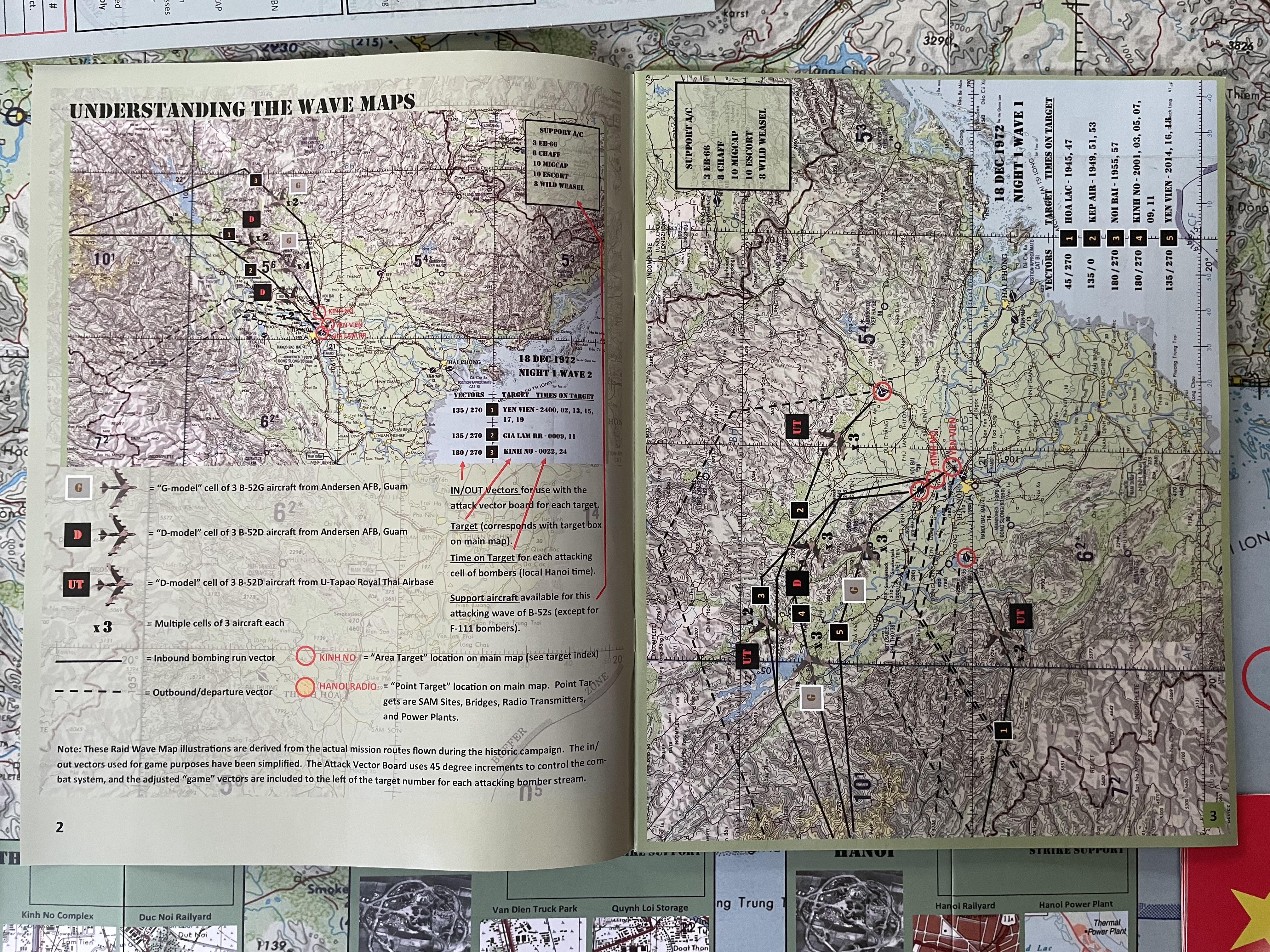 Linebacker II lasts up to 11 campaign nights (basically, multi-step game turns). Each campaign night contains several phases, simulating the complex events of the historialy night raid air campaign against North Vietnam from Dec 18—Dec 29, 1972. The NVA [North Vietnamese Army] player organizes their air defense assets and attempts to inflict aximum losses on the US forces. the US player executes a series of raid waves using B-52 bombers and a host of supporting aircraft each campaign night, inflicting damage on multiple stratgic targets in North Vietnam.