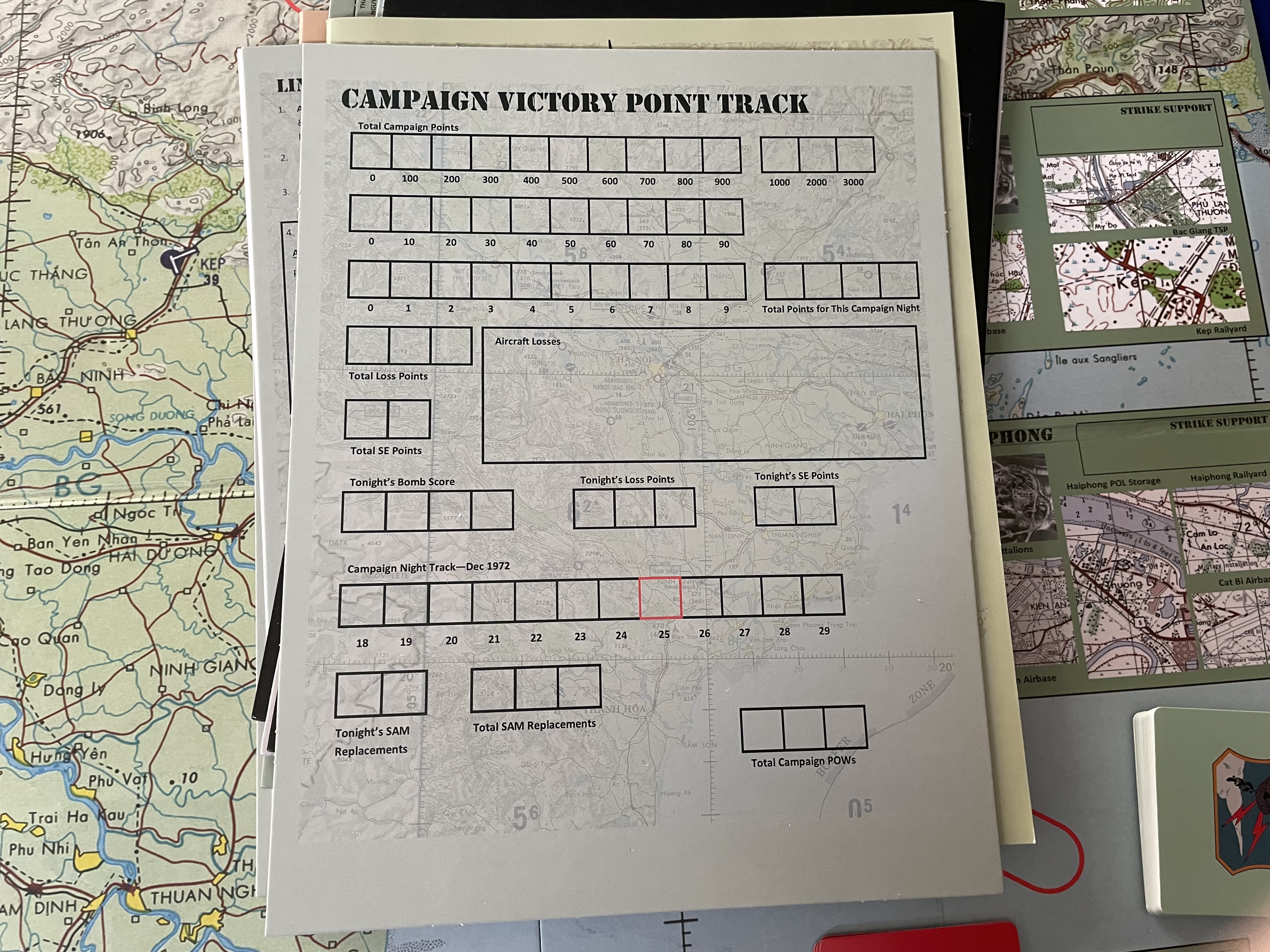At the end of each campaign night or phase, the US player checks to see if their cumulative bomb damage points and subtracts any loss points to get their victory point score. If the score meets the required total, the campaign continues for another night or phase. If not, the NVA player has won the contest.