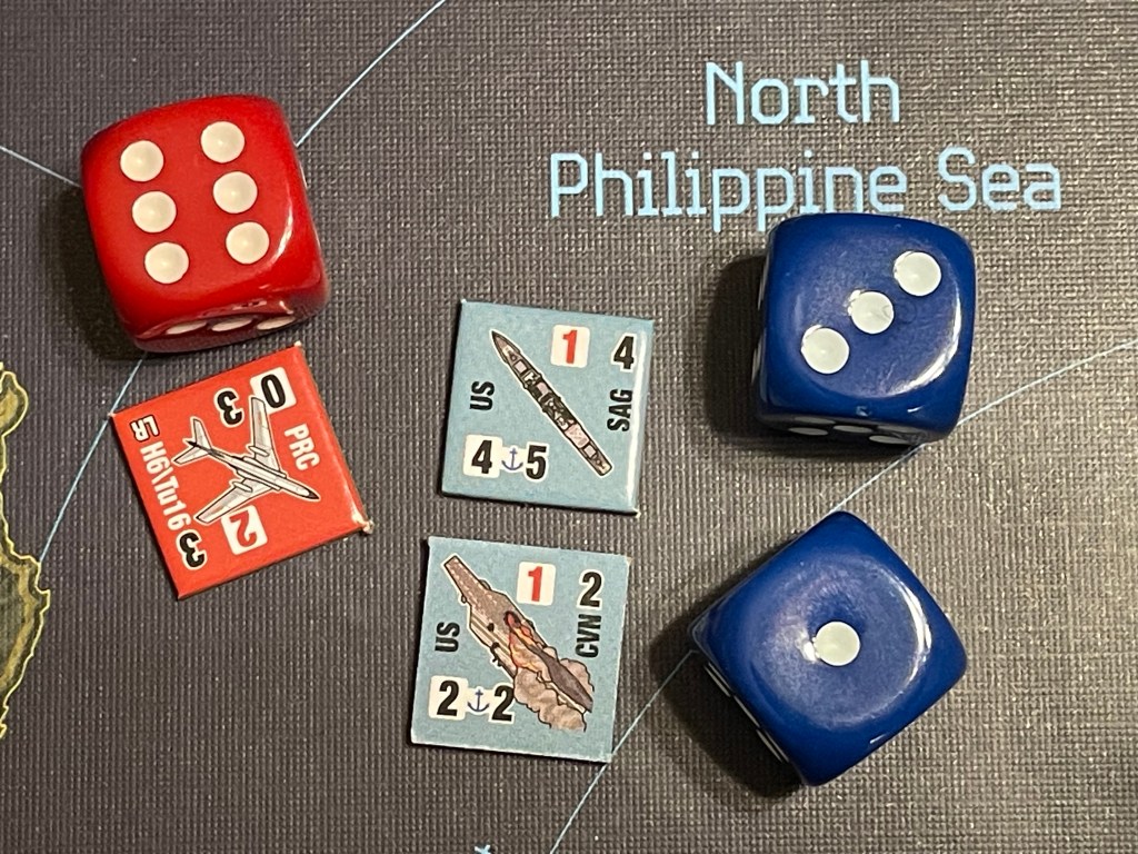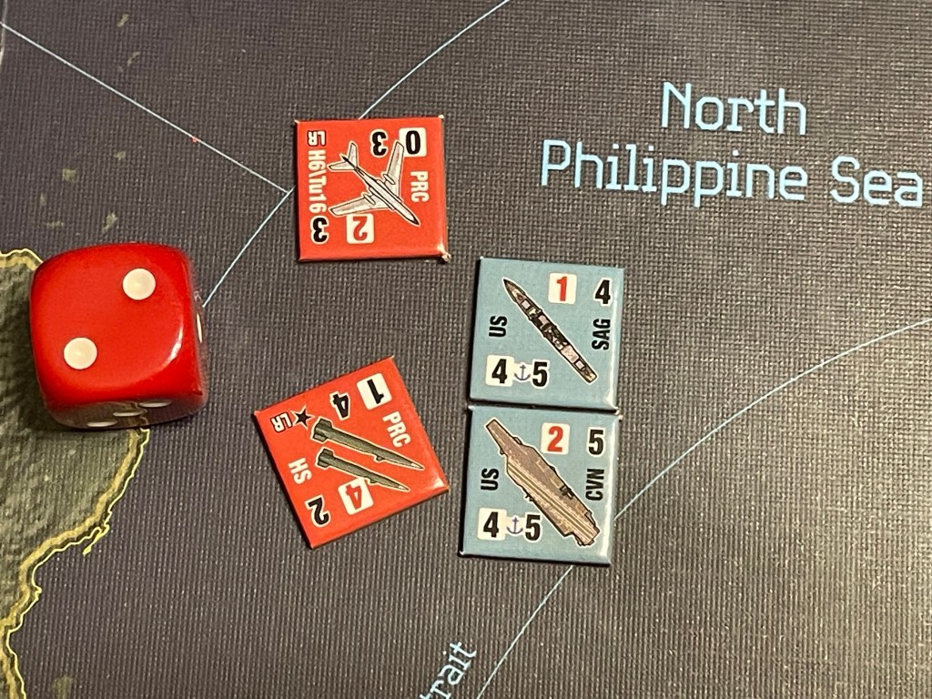 For example, a PRC J11/Su27 Air Unit is attacking a US LCS Naval Unit in the Taiwan Strait. The attacking J11 has an Anti-Surface Naval Factor of 3 while the defending LCS has an Anti-Air Factor of 3 and is Stealthy (+1 to enemy rolls to hit). Since the Taiwan Strait is an Astride Land Area (see 10.6 Naval Units Astride Land Areas) the PRC player gets a -1 die roll modifier which is offset by the Stealthy. The combat dice (d6) are rolled with the PRC player rolling an [5] (modified to 4 then back to 5) and the US player rolling a 4; both the PRC and US players miss as the LCS sails on.