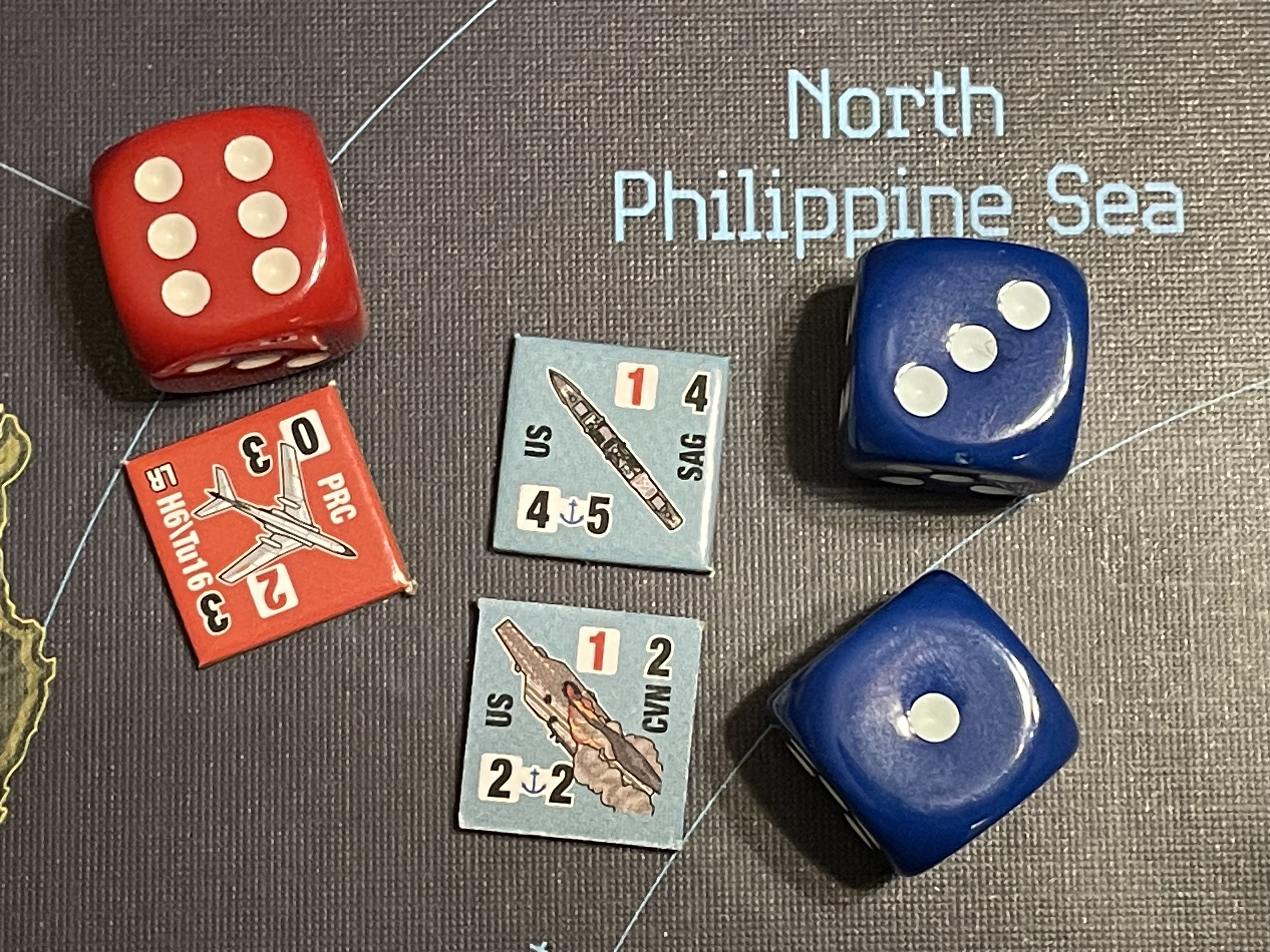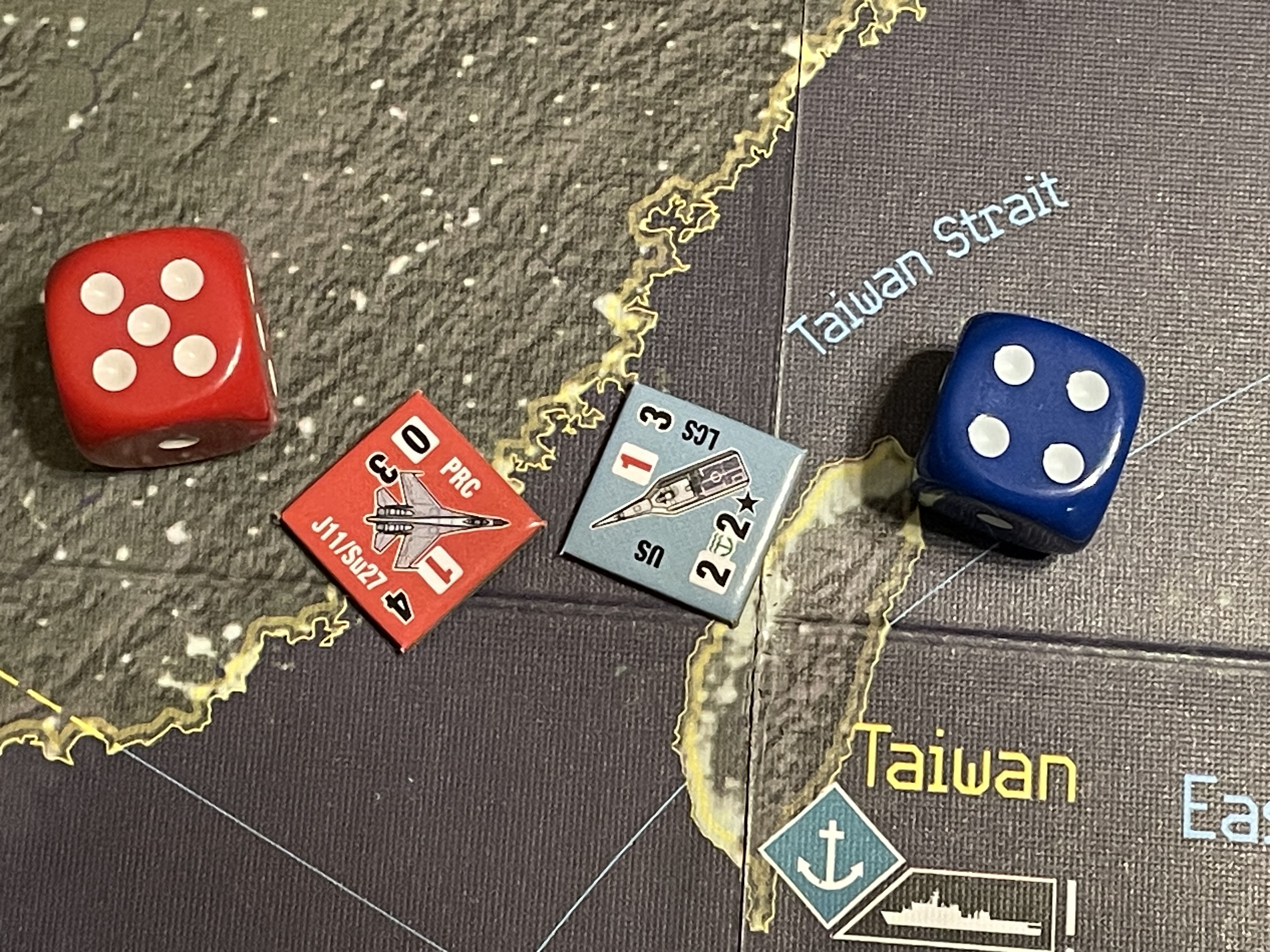 For example, a PRC J11/Su27 Air Unit is attacking a US LCS Naval Unit in the Taiwan Strait. The attacking J11 has an Anti-Surface Naval Factor of 3 while the defending LCS has an Anti-Air Factor of 3 and is Stealthy (+1 to enemy rolls to hit). Since the Taiwan Strait is an Astride Land Area (see 10.6 Naval Units Astride Land Areas) the PRC player gets a -1 die roll modifier which is offset by the Stealthy. The combat dice (d6) are rolled with the PRC player rolling an [5] (modified to 4 then back to 5) and the US player rolling a 4; both the PRC and US players miss as the LCS sails on.