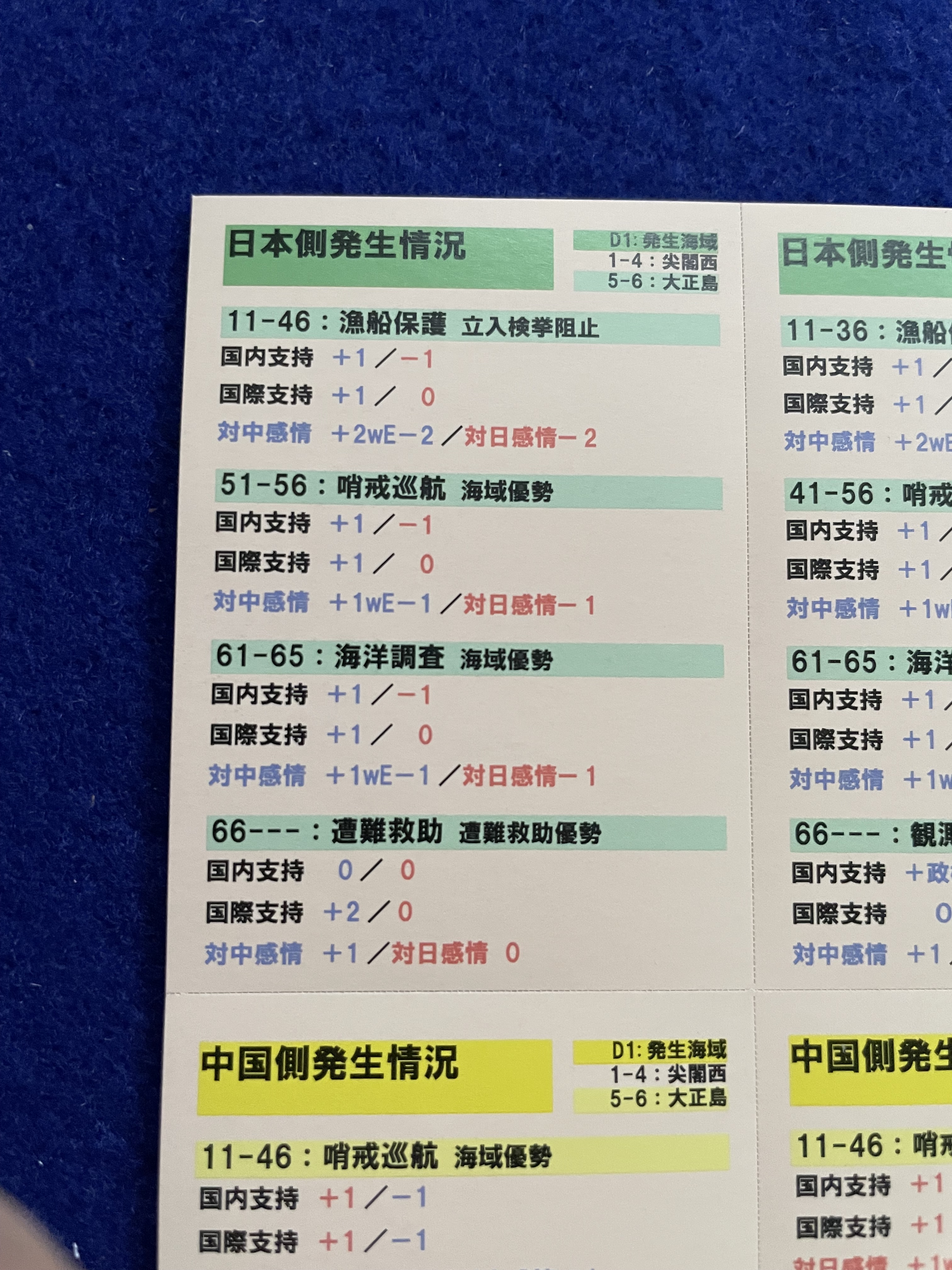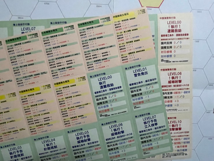 Cards also play an important role in Maritime Police vs. Coast Guard. There are 36 cards in the game each printed on thin, lightweight, slightly glossy cardstock and measuring a bit under 2″x3″; these definitely need to be sleeved for durability. The game includes ten Incident Situation Cards (5x Japanese, 5x PRC) along with 26 Escalation Cards (13x Japanese, 13x PRC).