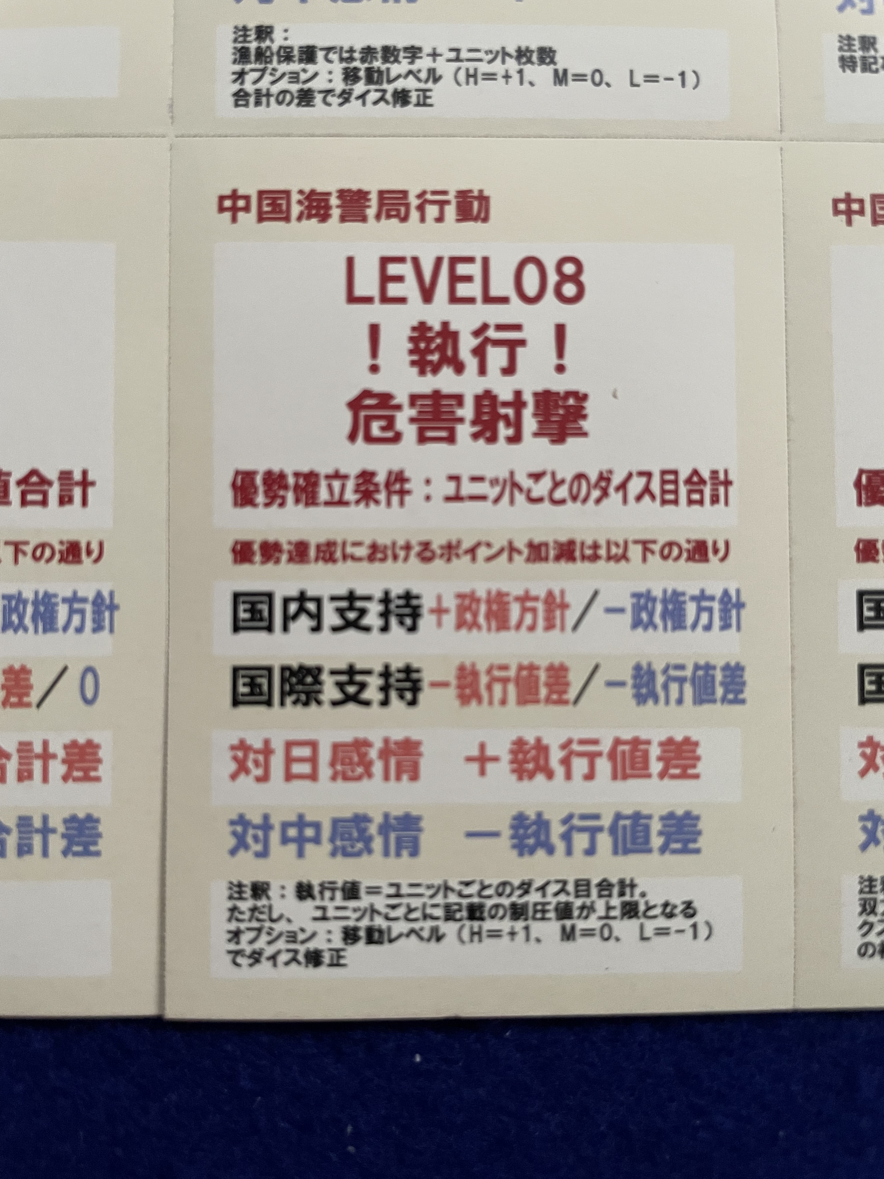 The Confrontation Management Step in Maritime Police vs. Coast Guard is in many respects a card duel. Both players have a hand of thirteen Escalation Cards going from Level 00 to Level 10 (some levels have more than one card to choose from). Most confrontations start at Level 01. Players then alternate playing confrontation cards higher in value than the last confrontation card played until one player declines to play a card. The confrontation is then resolved.